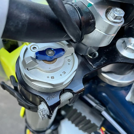 - 2 x ρυθμιστές κουμπιών εμπρός πιρουνιού από billet αλουμίνιο κατεργασμένο με CNC (ανωδιωμένη επιφάνεια) — έρχεται σε ζεύγος