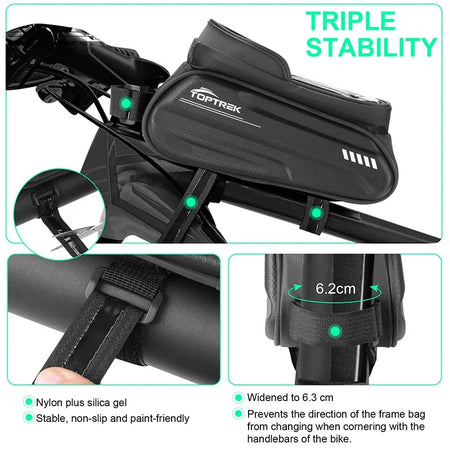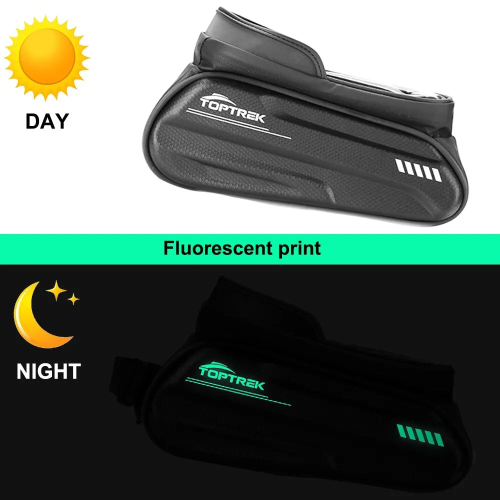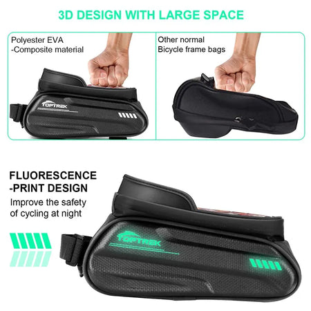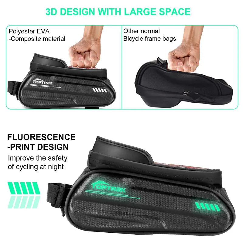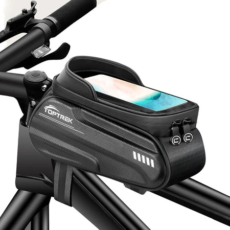 Αναβαθμίστε κάθε διαδρομή με την Τσάντα Ποδηλάτου Toptrek Top Tube με Θήκη Κινητού με Οθόνη Αφής σε εντυπωσιακή υφή PU carbon. Αυτή η τρισδιάστατη τσάντα top tube προσφέρει περισσότερο από 1 λίτρο αποθηκευτικού χώρου, κρατώντας το τηλέφωνό σας, τα κλειδιά και τα απαραίτητα ασφαλή καθώς οδηγείτε. Το ανθεκτικό σε γρατζουνιές και φθορά φινίρισμα PU carbon φαίνεται κομψό σε κάθε ποδήλατο, και ένα φθορίζον λογότυπο αυξάνει την ορατότητα για νυχτερινή οδήγηση.