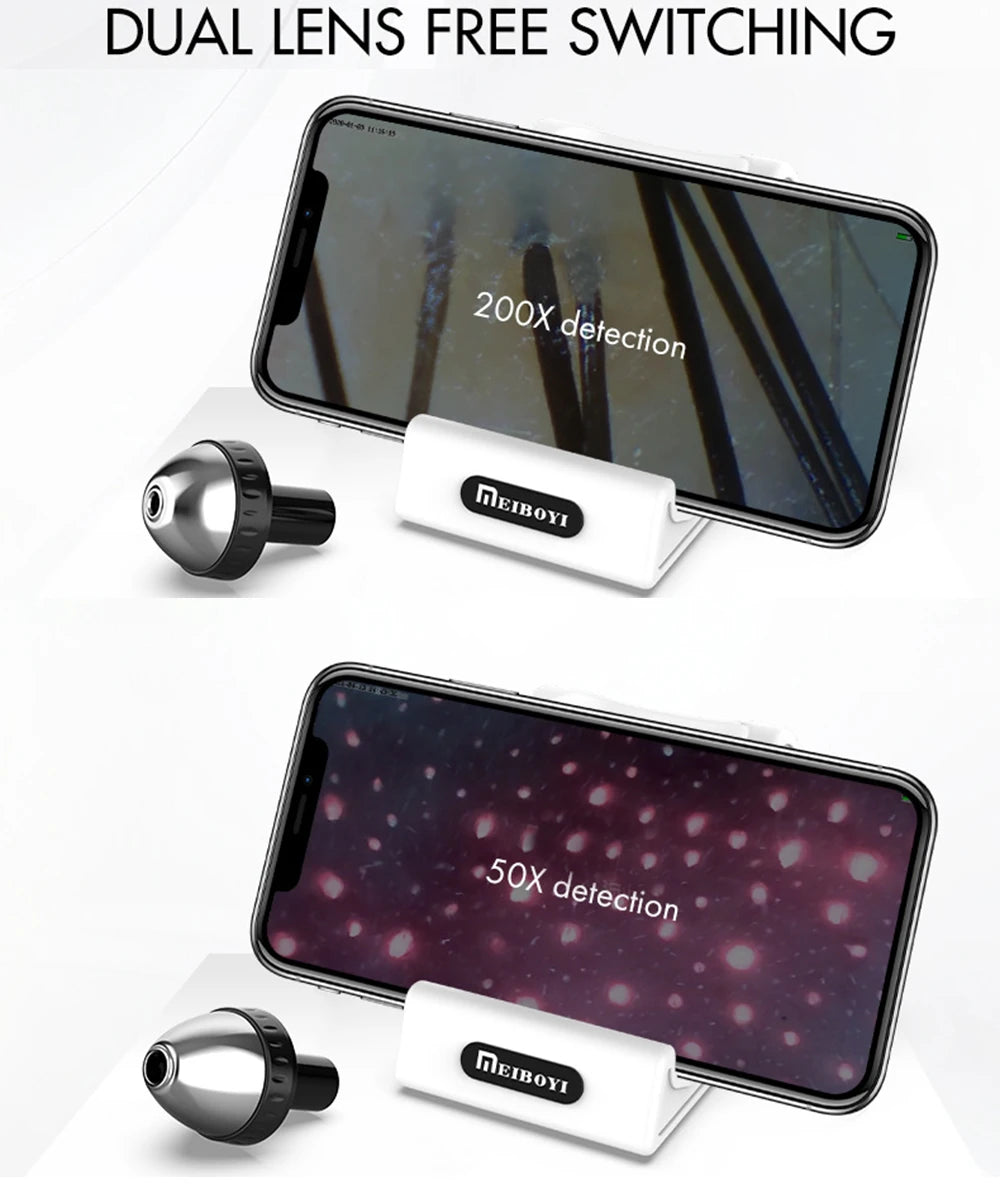 Σχεδιασμένος για ευκολία χρήσης, αυτός ο ασύρματος ανιχνευτής 2-σε-1 συνδέεται μέσω Wi-Fi με το smartphone ή το tablet σας και προσφέρει καθαρή HD απεικόνιση. Διαθέτει διπλούς ανιχνευτές με μεγέθυνση 50x και 200x και ανάλυση 1080P για λεπτομερή απεικόνιση των θυλάκων των τριχών και των στρωμάτων του δέρματος. Τρεις φασματικές λειτουργίες φωτισμού φωτίζουν διαφορετικά στρώματα του τριχωτού για ακριβή αξιολόγηση ξηρότητας, ισορροπίας λιπαρότητας, βλάβης, λέπια και συνολικής υγείας. Η συσκευή διαθέτει ξεχωριστό ασύρματο φορτιστή για ευκολία και ανθεκτική κατασκευή ABS/PC για αξιόπιστη καθημερινή χρήση. Η εφαρμογή Smart App Archive επιτρέπει εύκολη προβολή, αποθήκευση και κοινή χρήση αποτελεσμάτων σε συσκευές Android, iPhone και iPad.