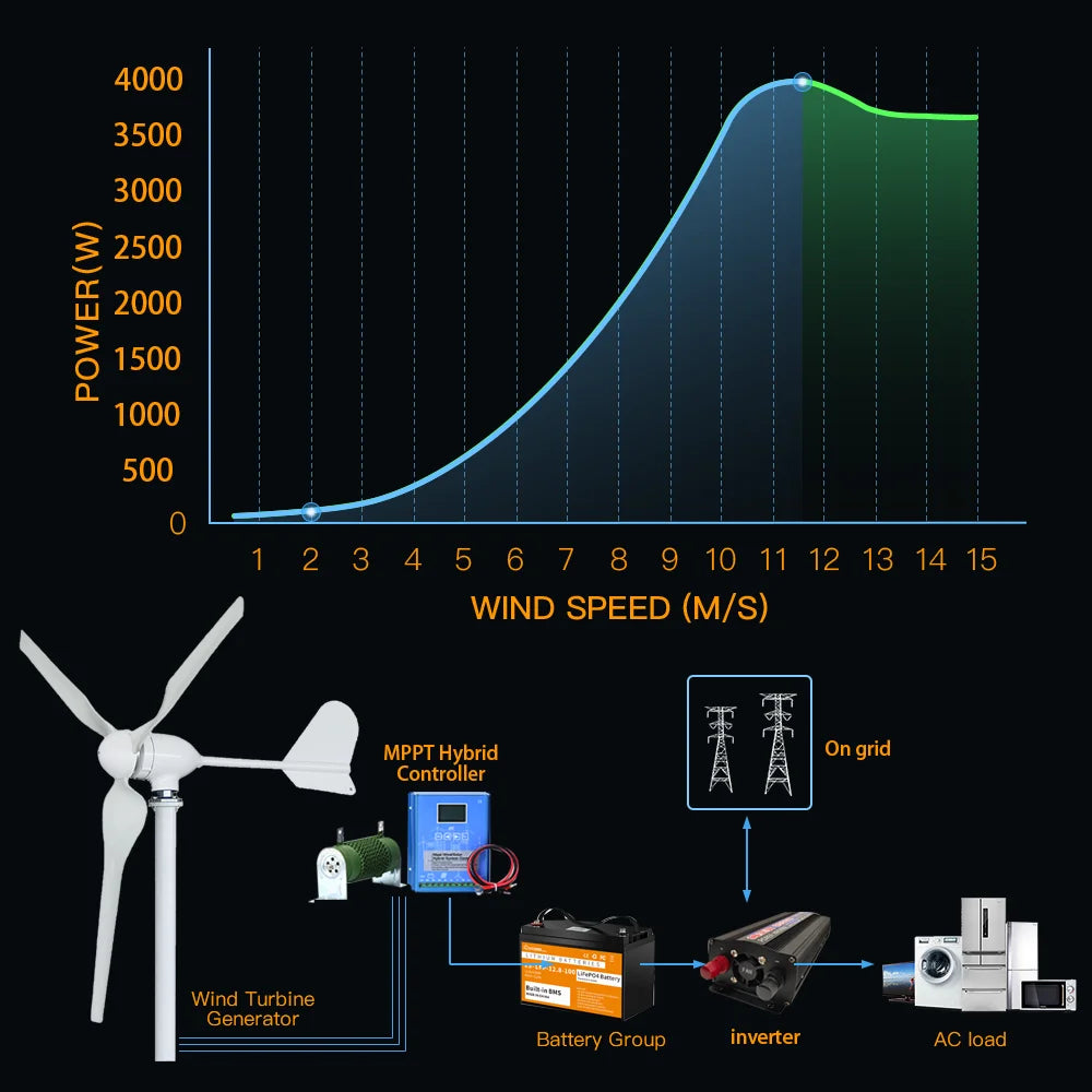 Σχεδιασμένο για ευελιξία, υποστηρίζει πολλαπλές ρυθμίσεις τάσης (24V, 48V, 96V) για να ταιριάζει σε ένα ευρύ φάσμα ηλεκτρικών συστημάτων. Με μια robust 6000W ονομαστική απόδοση και ευέλικτες επιλογές σταδιακής ισχύος (600W, 800W, 1500W), προσαρμόζεται σε διαφορετικές συνθήκες ανέμου, μεγιστοποιώντας τη συλλογή ενέργειας. Το σύστημα έχει σχεδιαστεί για λειτουργία με χαμηλό θόρυβο, εξασφαλίζοντας ηρεμία σε κατοικημένες περιοχές. Η εγκατάσταση γίνεται με συναρμολόγηση, καθιστώντας την εγκατάσταση απλή μόλις συνδεθεί σωστά με την αποθήκευση και το φορτίο σας.