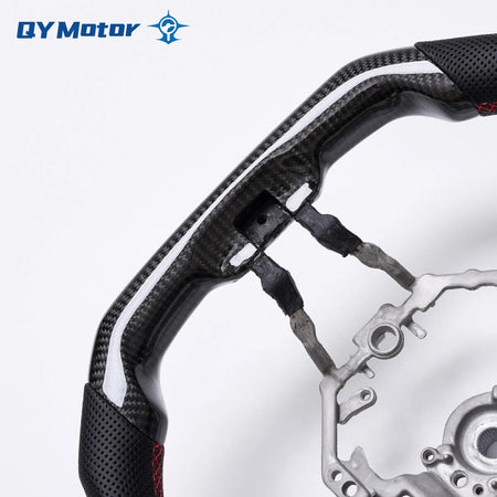 Η φινίρισμα από ίνα άνθρακα, η τολμηρή κόκκινη ραφή και η χαρακτηριστική στρογγυλή κορυφή με επίπεδο πάτο προσφέρουν μια αισθητική έτοιμη για αγώνες ενώ βελτιώνουν την απτική ανατροφοδότηση κατά την έντονη οδήγηση. Περιλαμβάνονται κοψίματα για μελλοντική συμβατότητα με paddle-shift (τα paddles δεν περιλαμβάνονται).