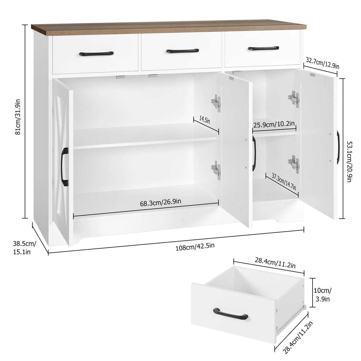 - Τοποθετήστε αυτό το μπουφέ σε σαλόνια ή εισόδους ως κομψό σταθμό αποθήκευσης για κλειδιά, αλληλογραφία και καθημερινά αντικείμενα, με ευρύχωρη επιφάνεια για έκθεση ή γρήγορη πρόσβαση.