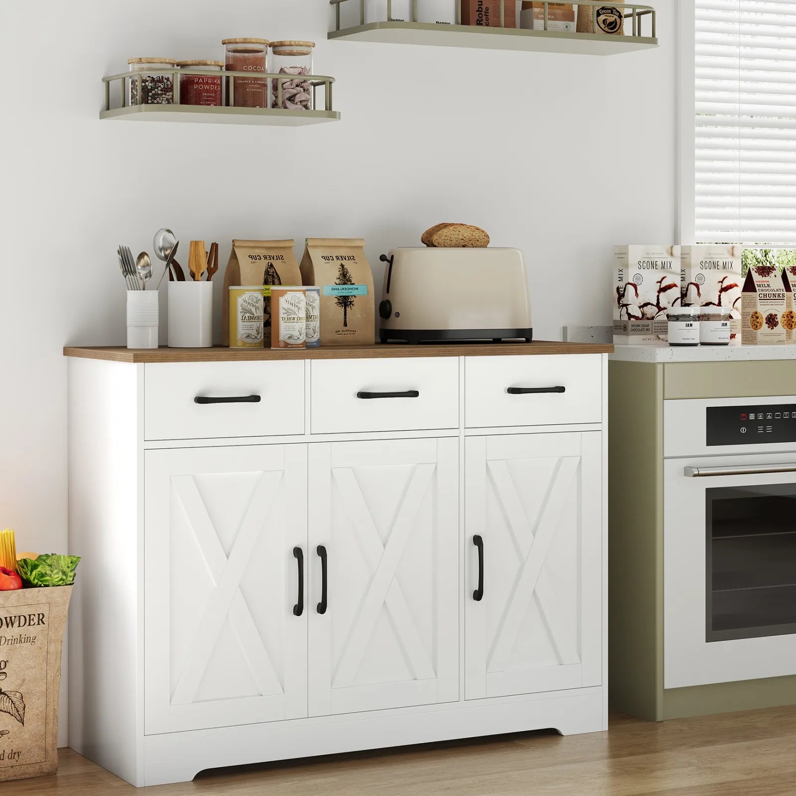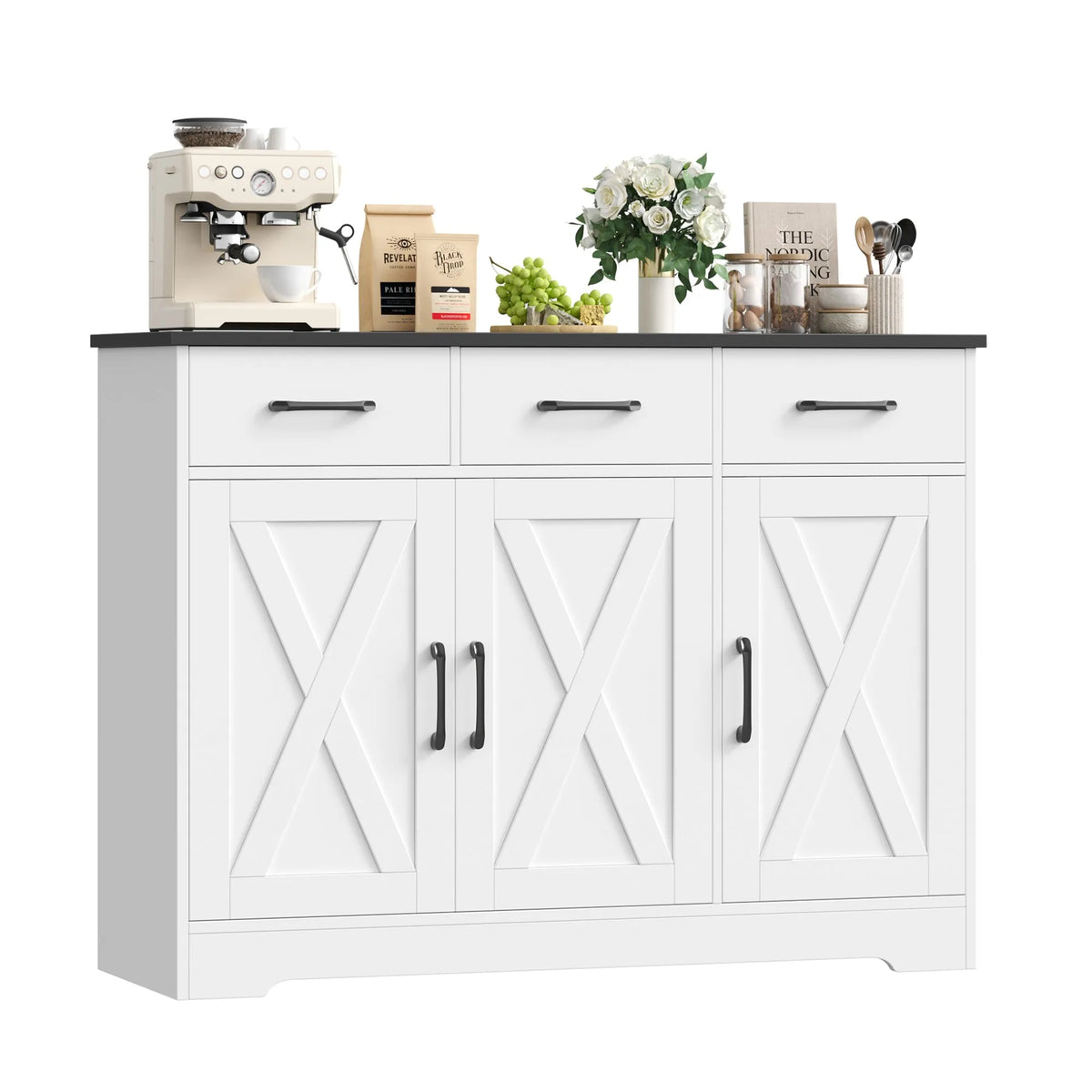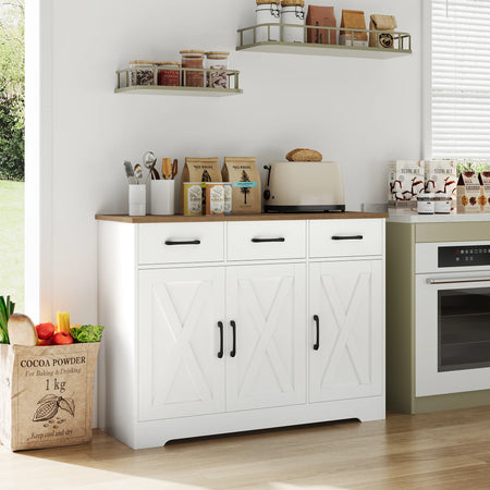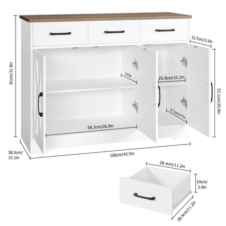Γνωρίστε το Classic Sideboard With 3 Drawers 3 Doors, μια ευέλικτη λύση αποθήκευσης για κουζίνα, τραπεζαρία, σαλόνι ή είσοδο. Κατασκευασμένο από υψηλής ποιότητας μοριοσανίδα, αυτό το μπουφέ είναι ανθεκτικό, στιβαρό και σταθερό. Η επιφάνεια είναι ανθεκτική στη φθορά και εύκολη στον καθαρισμό, καθιστώντας τη χρήση καθημερινά απλή.