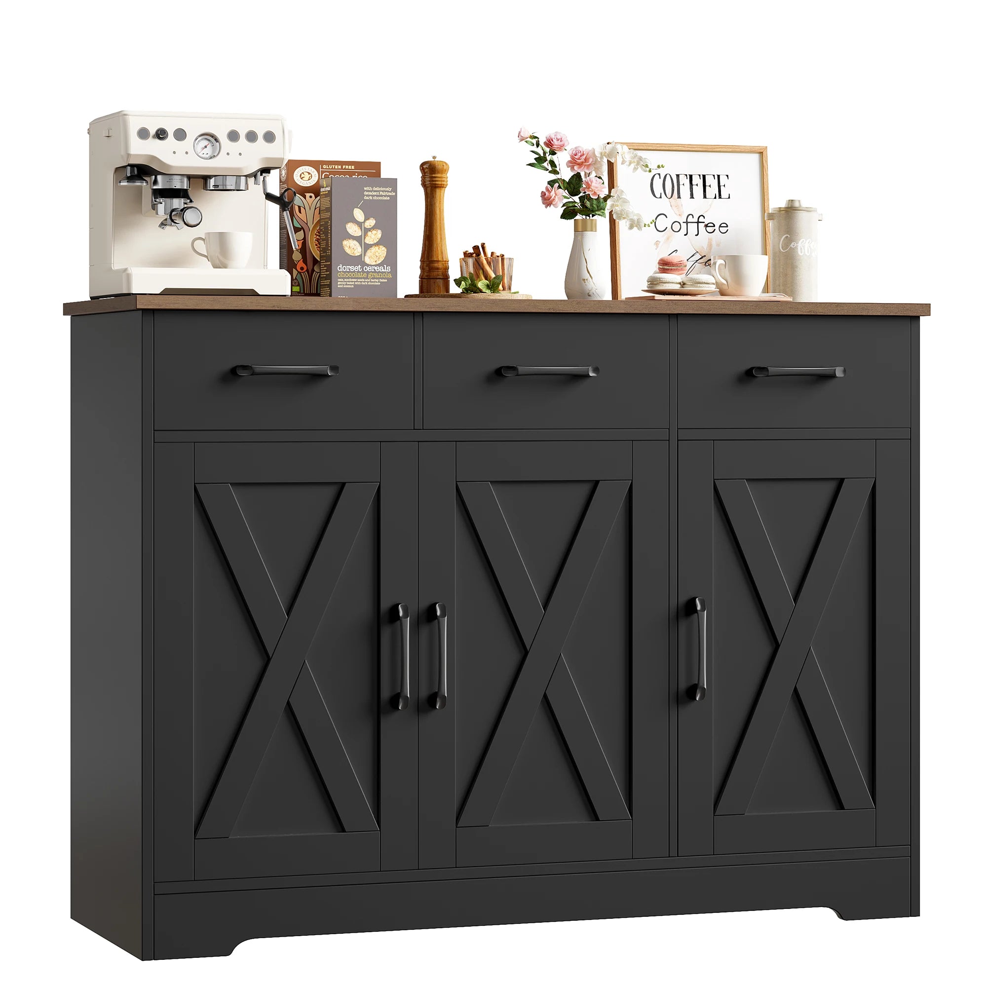 Η μονάδα διαθέτει μεγάλη επιφάνεια εργασίας στην κορυφή για προετοιμασία, έκθεση ή σερβίρισμα, με διαστάσεις 108x38,5 εκ. Περιλαμβάνει 3 συρτάρια με ομαλή ολίσθηση για μαχαιροπίρουνα και μικρά αντικείμενα, καθώς και 2 ντουλάπια βάσης με εσωτερικά ράφια για τακτική αποθήκευση φλιτζανιών, επιπλέον μαχαιροπίρουνων και απαραίτητων. Με συνολικά 3 συρτάρια και 3 πόρτες, θα απολαύσετε οργανωμένη αποθήκευση που κρατά τον χώρο σας τακτοποιημένο και κομψό.