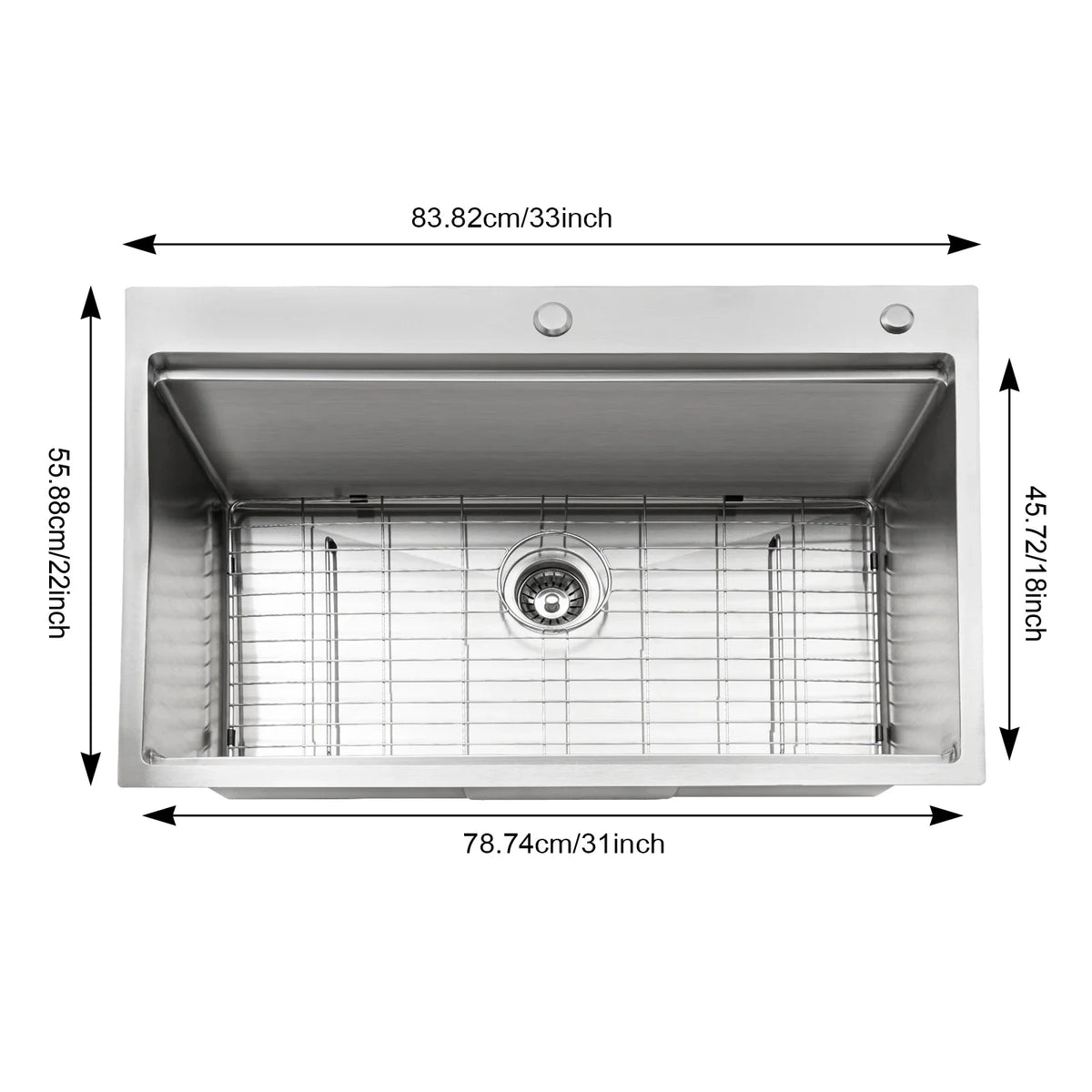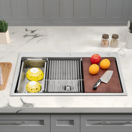 Αναβαθμίστε την κουζίνα σας με τον 33-ιντσών νεροχύτη κουζίνας από ανοξείδωτο ατσάλι 304 με ενιαίο μπολ. Κατασκευασμένος από υψηλής ποιότητας ανοξείδωτο ατσάλι 304 με φινίρισμα σύρματος, αυτός ο νεροχύτης προσφέρει μια λαμπερή, ανθεκτική στη φθορά και στη διάβρωση επιφάνεια που αντέχει στη καθημερινή χρήση. Το μεγεθυμένο, βαθύ ορθογώνιο μπολ (31" x 18" εσωτερικά, 9" βάθος) παρέχει άφθονο χώρο για το πλύσιμο μεγάλων σκευών, πιάτων και ακόμη και μιας στοίβας φρούτων και λαχανικών, ενώ ελαχιστοποιεί τις πιτσιλιές χάρη στη βαθύτερη λεκάνη του.