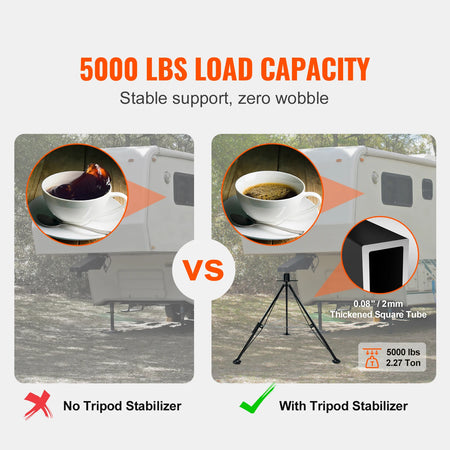 Ζήστε σταθερότητα βράχου με τον 5000 Lbs Σταθεροποιητή Τρίποδα για Κατασκηνωτές. Αυτός ο βαρέως τύπου σταθεροποιητής έχει σχεδιαστεί για να σταματά την κίνηση του ρυμουλκούμενου, προσφέροντάς σας μια σταθερή πλατφόρμα για μαγείρεμα, καθαρισμό και κίνηση μέσα στο RV σας—έτσι μπορείτε να απολαύσετε τις περιπέτειές σας χωρίς να ανησυχείτε για ανεπιθύμητες κουνήσεις.