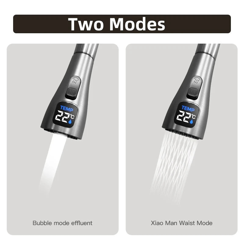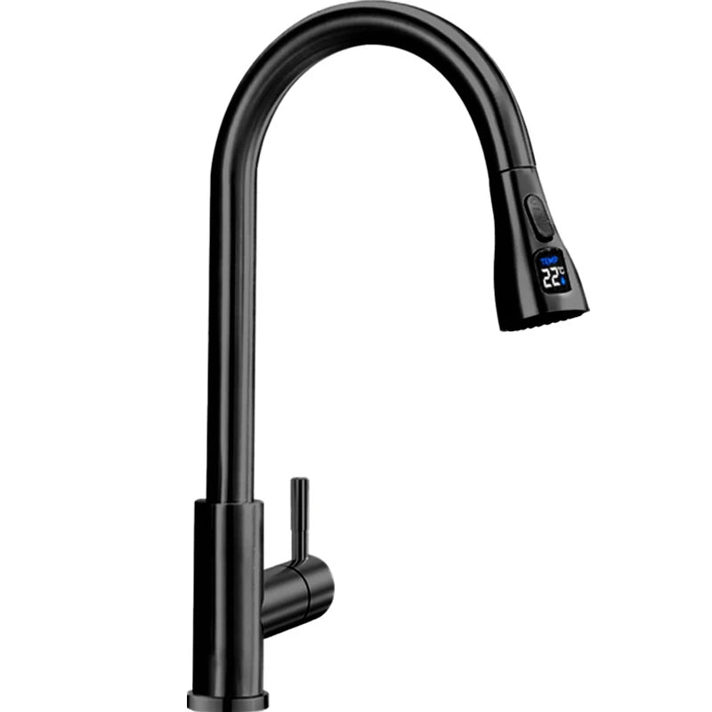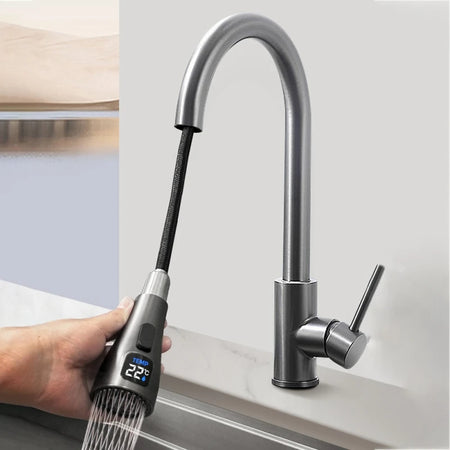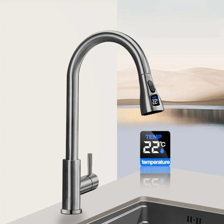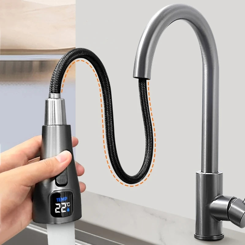 Κουζίνα Βρύση με Οθόνη Θερμοκρασίας – Ψεκαστήρας που Βγαίνει Έξω — μια βρύση κουζίνας από ανοξείδωτο χάλυβα τοποθετημένη σε πάγκο με βολικό ψεκαστήρα που βγαίνει έξω και ενσωματωμένη οθόνη θερμοκρασίας για ακριβή έλεγχο ζεστού & κρύου.