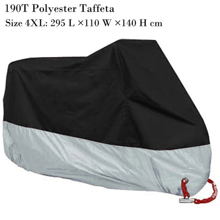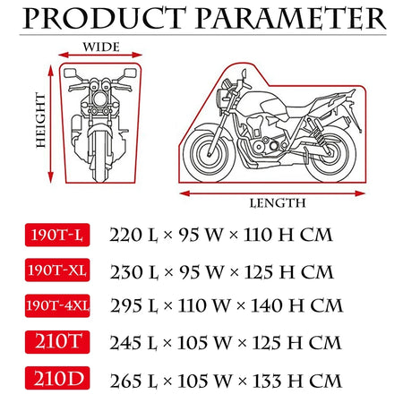 - Παρακαλούμε μετρήστε τη μοτοσυκλέτα σας, συμπεριλαμβανομένου οποιουδήποτε πίσω κουτιού, για να επιβεβαιώσετε το σωστό μέγεθος πριν την αγορά. Το μέγεθος 210D XXXL μετρά περίπου 265 x 105 x 133 εκ, κατάλληλο για τις περισσότερες μοτοσυκλέτες έως ~2 μέτρα μήκος.