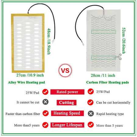 - Συνολική ισχύς κιτ: έως 108W ανά κιτ (μέγιστο κιτ); Αξιολογήσεις επιφάνειας: Θερμαντικές επιφάνειες από ανθρακονήματα ~100W ανά κιτ; Θερμαντικές επιφάνειες από καλώδιο κράματος ~100W ανά κιτ