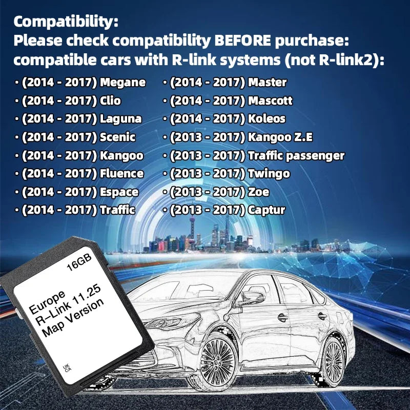 - Επιβεβαιώστε ότι το όχημά σας χρησιμοποιεί R‑Link 11.25 πριν από την αγορά. Μην αφαιρείτε την κάρτα SD κατά την εγκατάσταση χαρτών ή τις ενημερώσεις συστήματος.