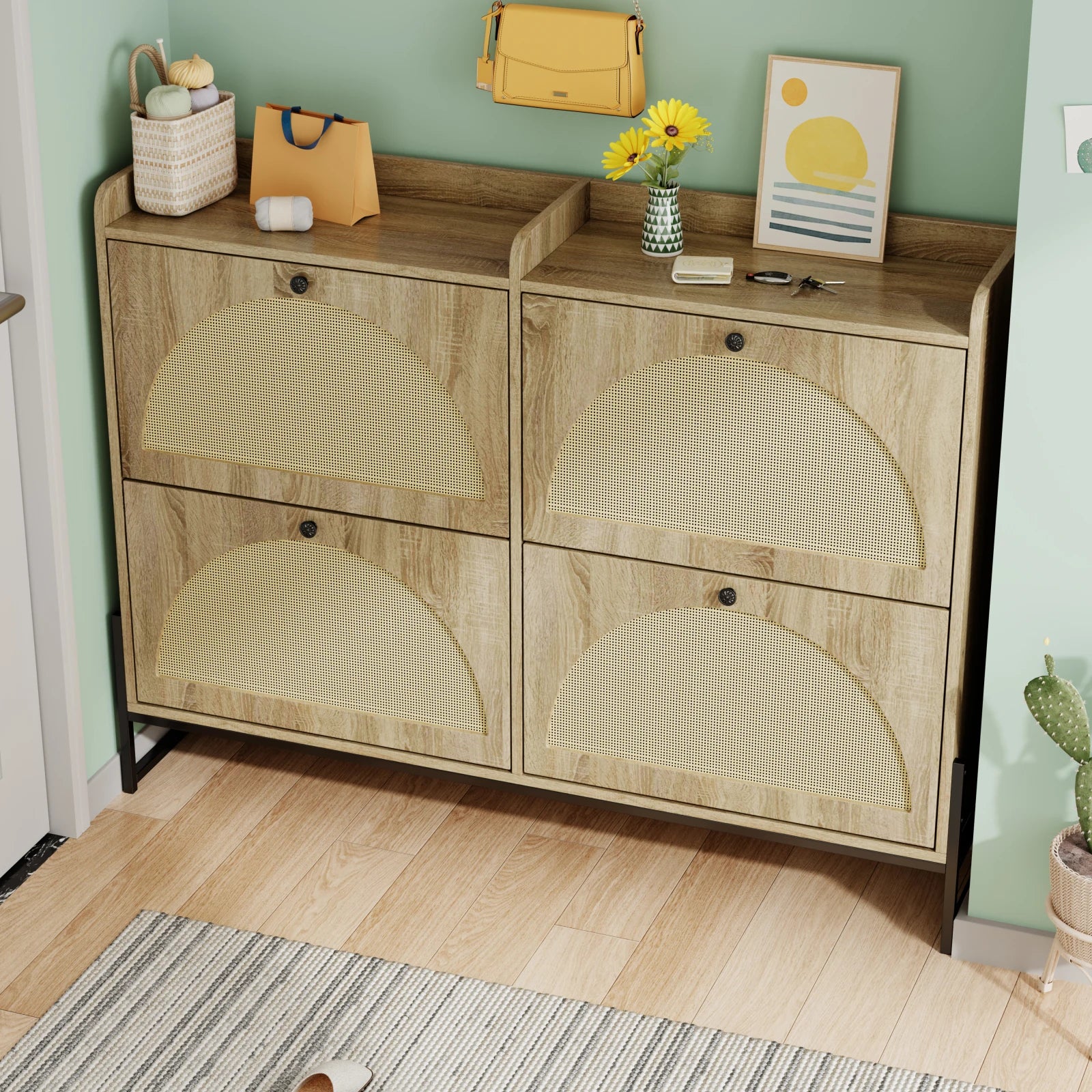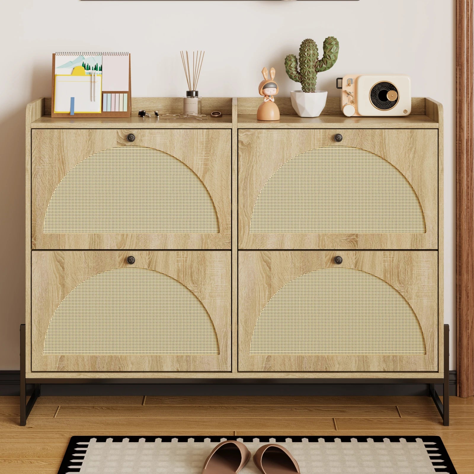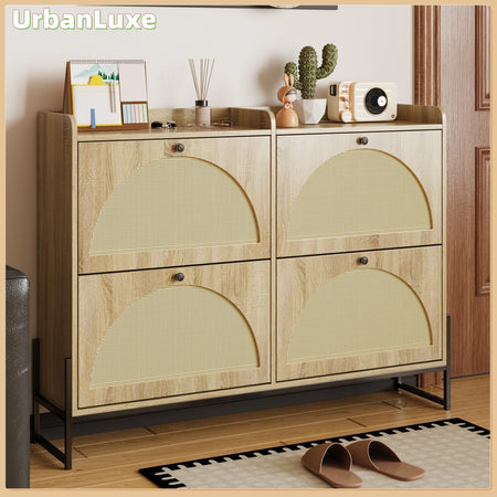 Urban Luxe 4 Φτερωτό Ρυθμιζόμενο Στενό Ντουλάπι Παπουτσιών συνδυάζει μοντέρνο στυλ με πρακτική, εξοικονόμηση χώρου αποθήκευση για εισόδους και σαλόνια. Κατασκευασμένο με PE ράτταν και φινιρισμένο με φυσική υφή ξύλου στην πόρτα, αυτό το μινιμαλιστικό ντουλάπι προσθέτει μια νότα ήρεμης κομψότητας ενώ κρατά τα παπούτσια τακτοποιημένα οργανωμένα. Οι τέσσερις φτερωτές πόρτες προσφέρουν εύκολη πρόσβαση και ασφαλή αποθήκευση, ενώ οι στρογγυλεμένοι πάνω και πλαϊνοί τοίχοι προστατεύουν από χτυπήματα και κρατούν τα αντικείμενα ασφαλή στη θέση τους. Οι μαύρες λαβές και τα χρυσά μεταλλικά πόδια προσθέτουν μια σύγχρονη πινελιά που ταιριάζει σε μια μεγάλη γκάμα διακοσμήσεων σπιτιού. Μια αναπνεύσιμη πλάτη με οπές αερισμού προάγει την κυκλοφορία του αέρα για να διατηρεί το εσωτερικό στεγνό και φρέσκο.