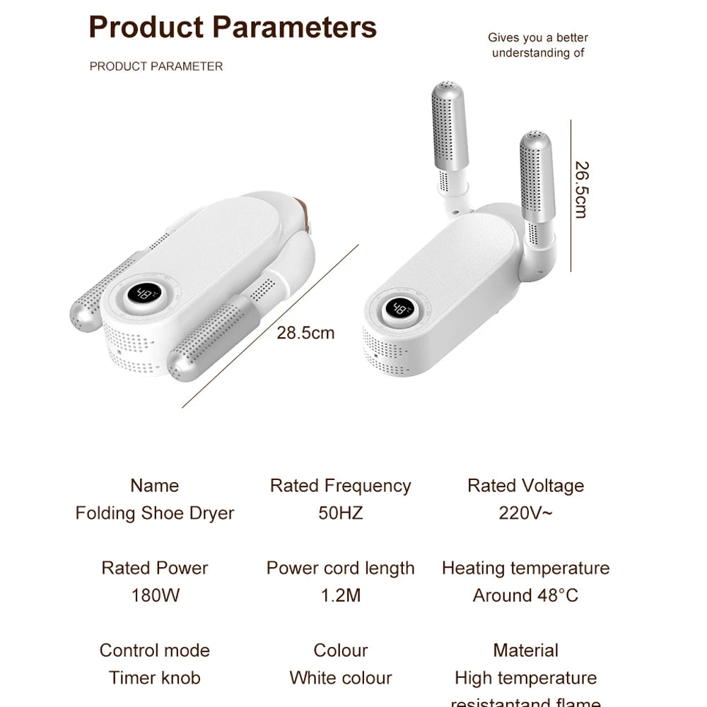 Η μονάδα έχει σχεδιαστεί για να είναι χωρίς χημικά, εξασφαλίζοντας μια ασφαλή, χωρίς οσμές διαδικασία στεγνώματος για τα υποδήματά σας. Ο αναδιπλούμενος σχεδιασμός και η ελαφριά κατασκευή του την καθιστούν μια βολική προσθήκη σε οποιαδήποτε ρουτίνα φροντίδας υποδημάτων.