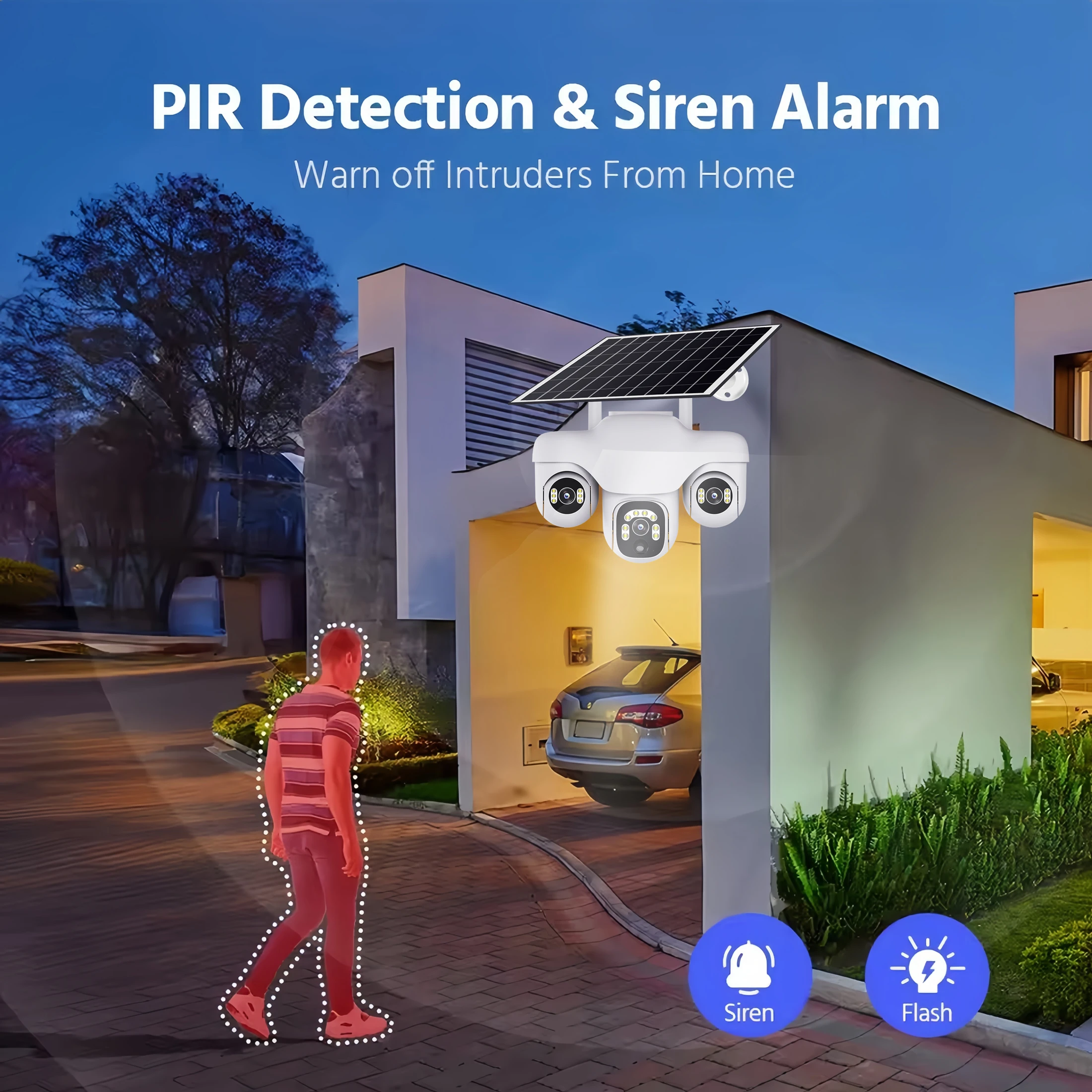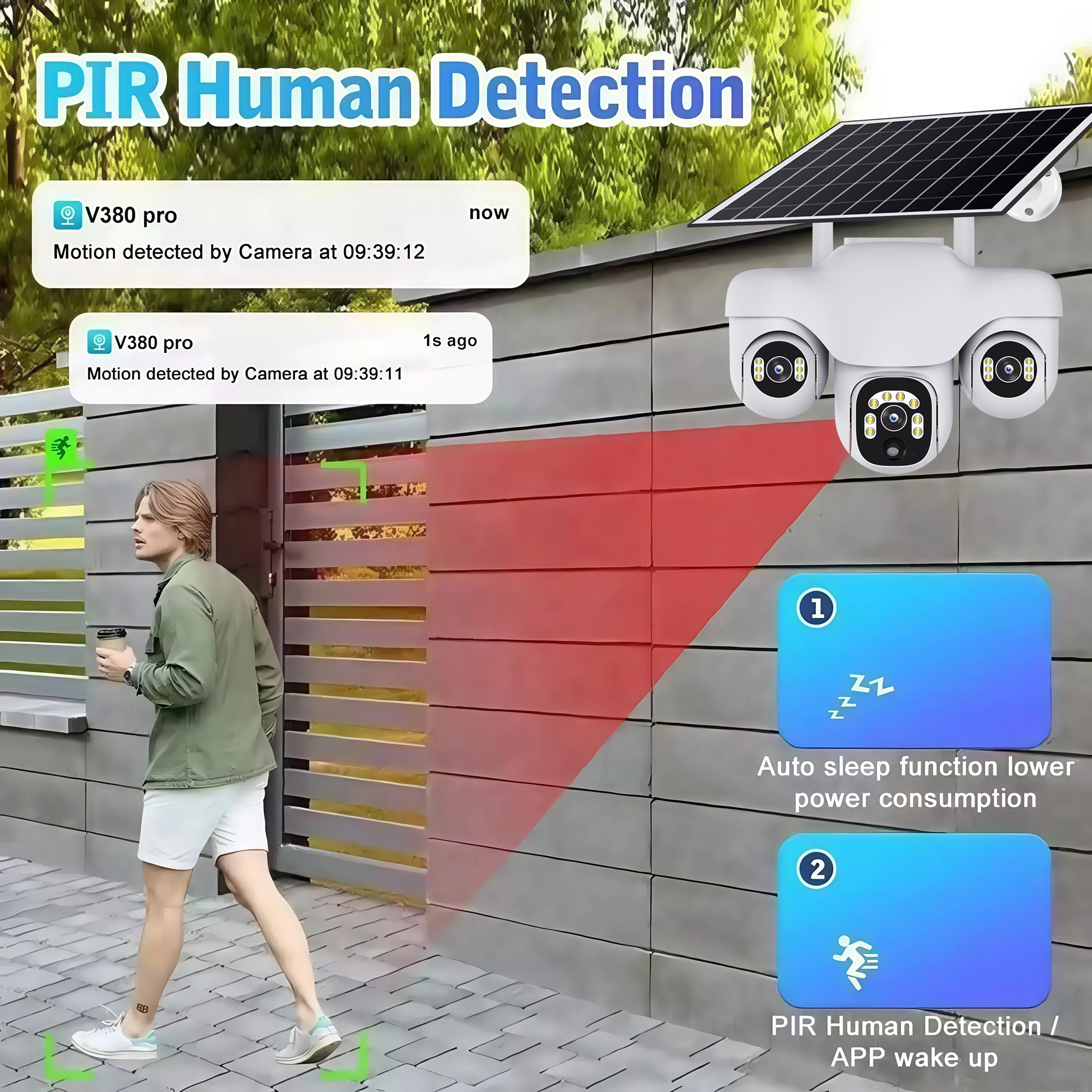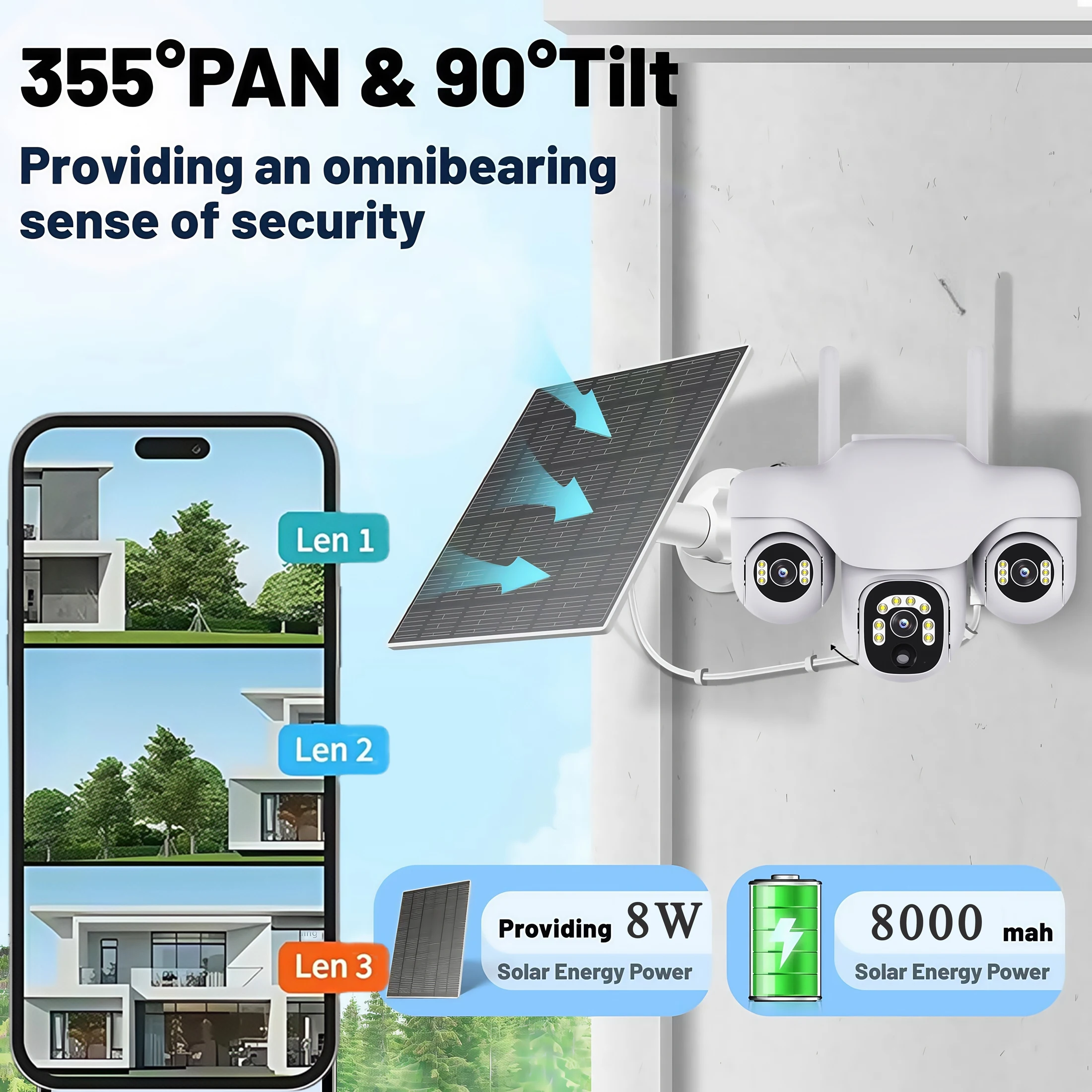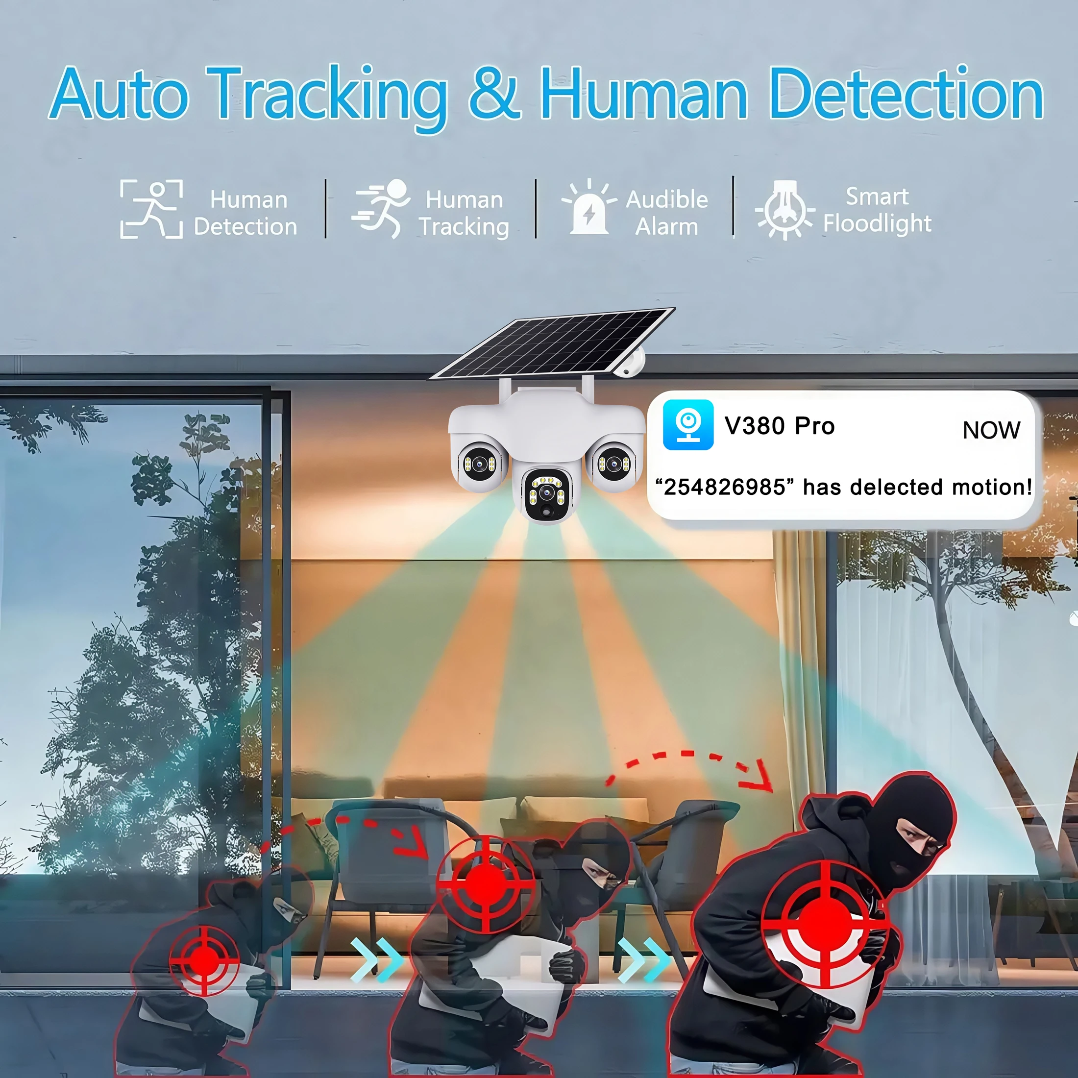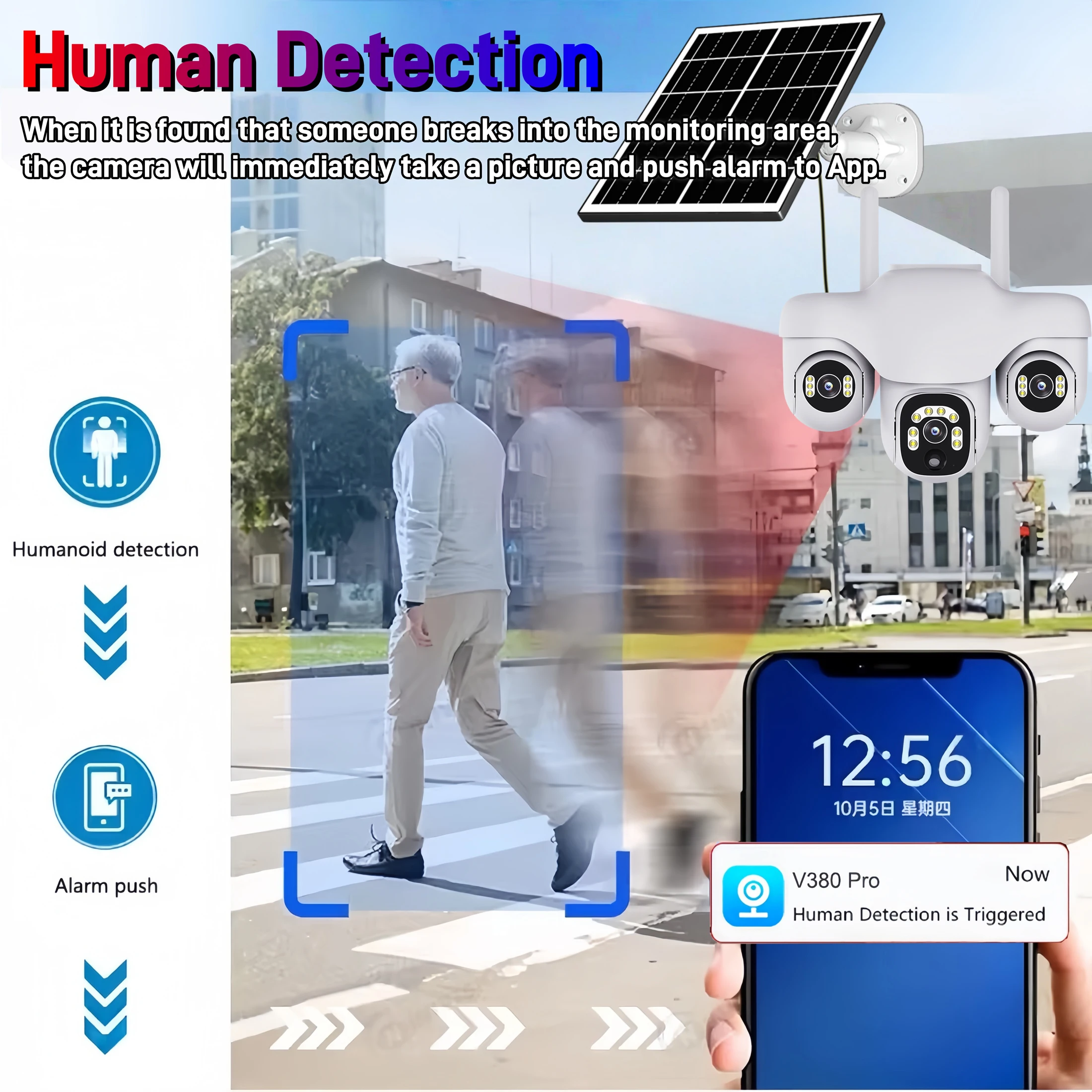 V380 Pro 15MP Ηλιακή Κάμερα Τριπλού Φακού Τριπλή Κάμερα PTZ Δύο-Δρόμων Ήχου Εξωτερική Ενσωματωμένη Μπαταρία Ασφαλείας CCTV HD 4G IP Κάμερα