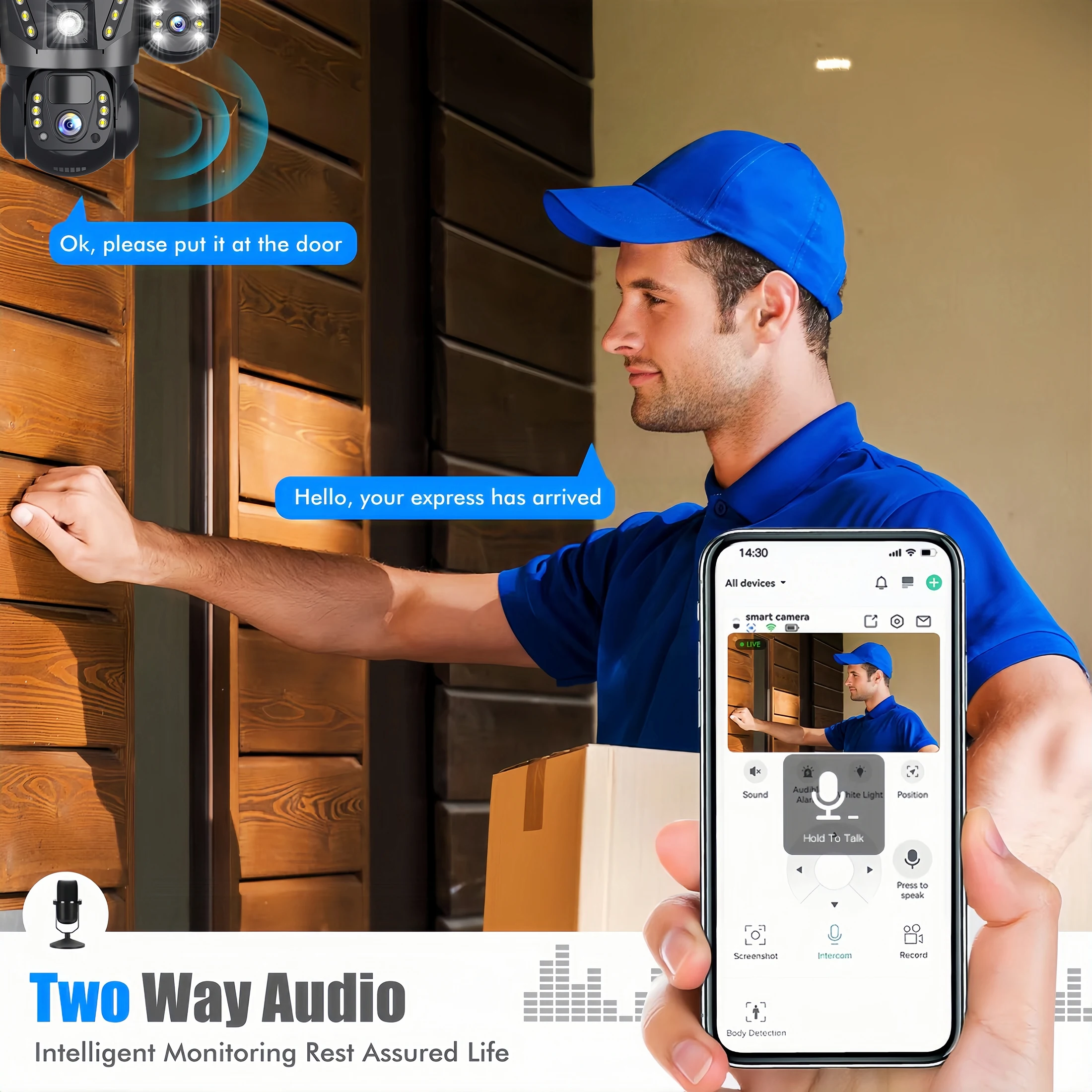 Ενσωματωμένο μικρόφωνο και ηχείο / Προσαρμοσμένα νέα ηχεία με δυνατό ήχο; Μπορείτε να μιλήσετε με οποιονδήποτε βρίσκεται κοντά στην κάμερα (Προειδοποιήστε κάποιον να φύγει από το σπίτι σας).