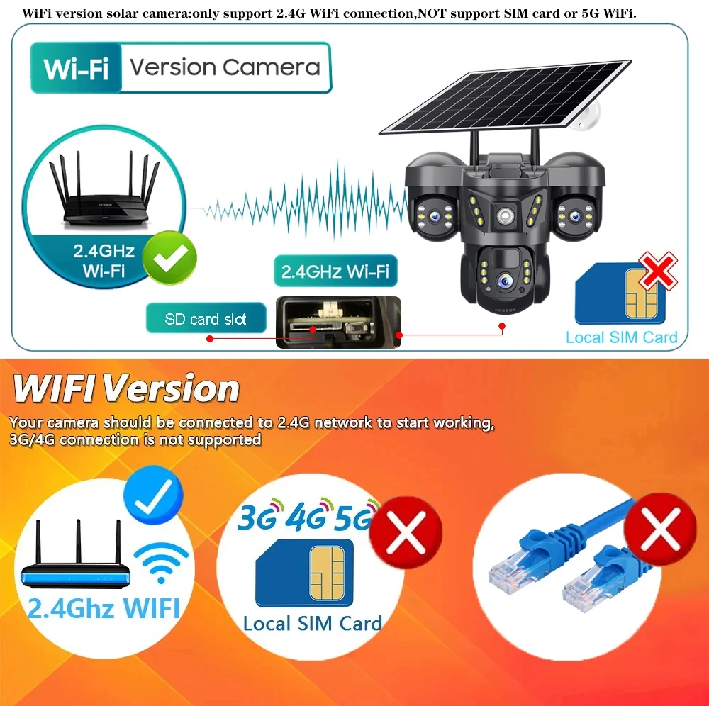 Ηλιακή κάμερα έκδοσης WiFi: υποστηρίζει μόνο σύνδεση WiFi 2.4G, ΔΕΝ υποστηρίζει κάρτα SIM ή 5G WiFi.