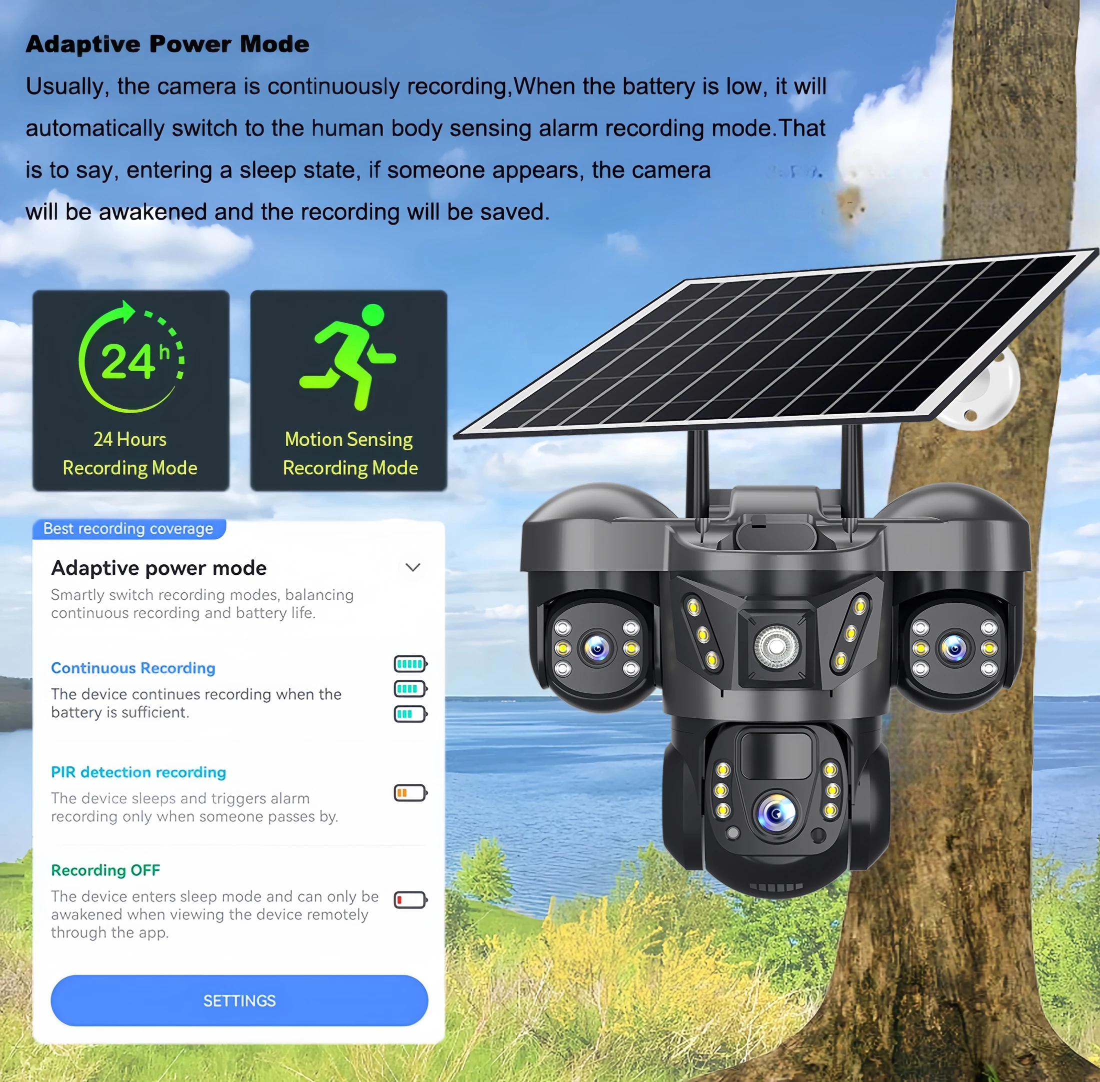 Η κάμερα μπορεί να αποσπαστεί με μια μπαταρία μεγάλης χωρητικότητας, και το επάνω ηλιακό πάνελ μετατρέπεται σε ενέργεια μέσω απορρόφησης και θερμικής απορρόφησης για τροφοδοσία.