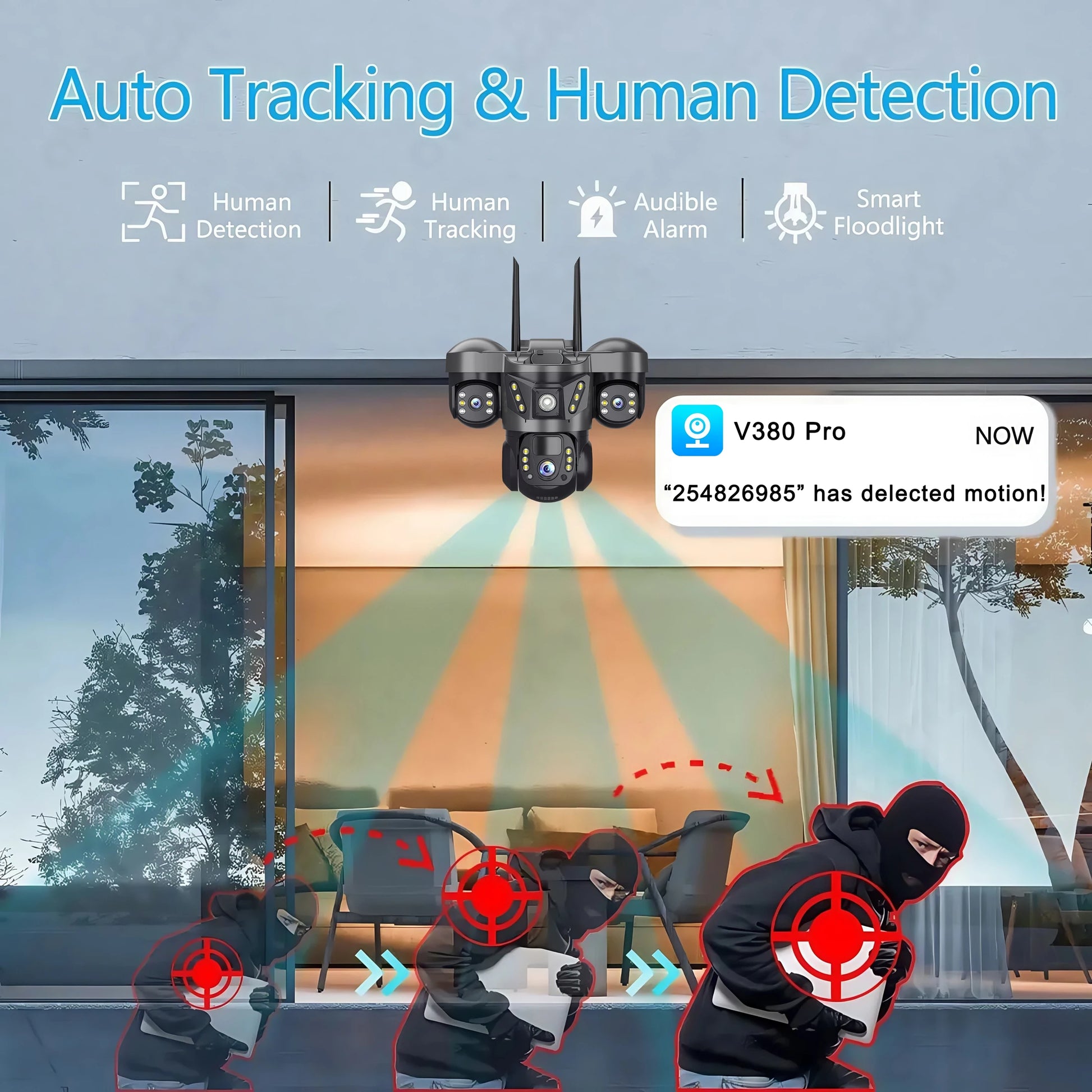 Βρίσκει γρήγορα ανθρώπινους στόχους και στέλνει αμέσως μια ειδοποίηση στο τηλέφωνό σας, επιτρέποντάς σας να δείτε τι συμβαίνει οπουδήποτε. Ανιχνεύει μόνο το ανθρώπινο σχήμα και δεν θα ενεργοποιηθεί ψευδώς για αντικείμενα όπως αυτοκίνητα και δέντρα.