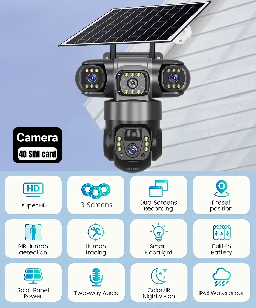 V380 Pro Ηλιακή Κάμερα 4G SIM Εξωτερική Τριών Φακών Τριών Οθονών PIR Ανίχνευση Ανθρώπων CCTV Ασφάλεια Μπαταρίας PTZ IP Κάμερα Αγροκτήματος Οπωρώνα