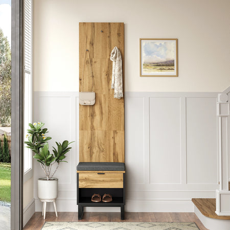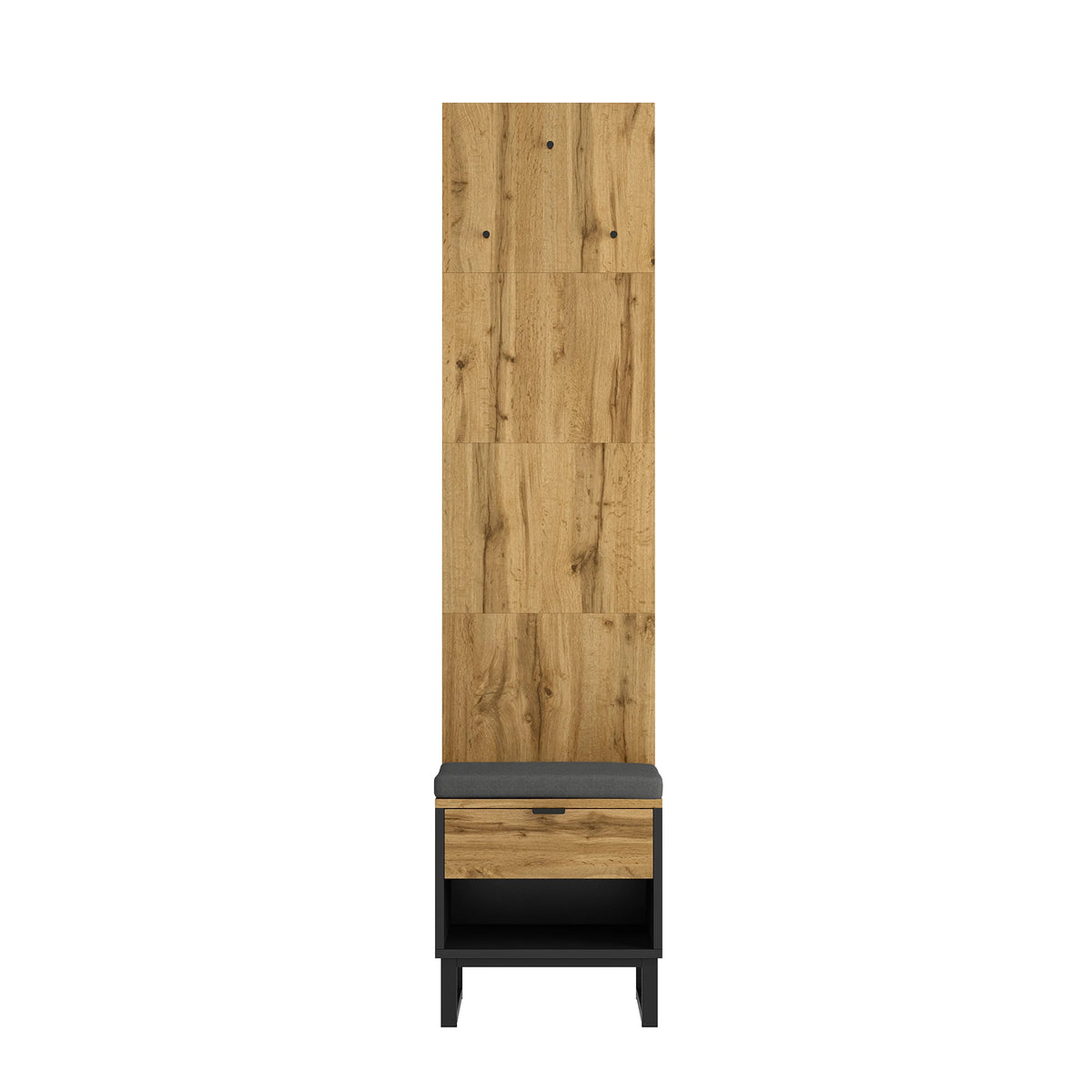 Αναβαθμίστε την είσοδό σας με το Σετ Ντουλάπας με Υφή Βελανιδιάς με Πάγκο Παπουτσιών και Μαξιλάρι—μια κομψή, εξοικονομούσα χώρο λύση που συνδυάζει τα ρουστίκ πάνελ βελανιδιάς με ένα κομψό μεταλλικό πλαίσιο από μαύρο σίδερο. Με ύψος 210 εκ., αυτή η πολυλειτουργική ντουλάπα προσφέρει πρακτική αποθήκευση, άνετο χώρο καθίσματος και έξυπνους γάντζους για να κρατάτε παλτά, καπέλα, κλειδιά και τσάντες σε εύκολη πρόσβαση. Το μαξιλαρωμένο μαξιλάρι σκούρου γκρι στον πάγκο παπουτσιών σας προσκαλεί να βγείτε ή να μπείτε στο σπίτι με άνεση, ενώ το ανοιχτό κάτω διαμέρισμα και το μεταλλικό πλαίσιο ύψους 15 εκ. μεγιστοποιούν την αποθήκευση για παντόφλες και μικρά αντικείμενα. Η αντίθεση της υφής βελανιδιάς με τις μαύρες λεπτομέρειες προσδίδει μια μοντέρνα, διαχρονική εμφάνιση σε διαδρόμους, χώρους εισόδου ή υπνοδωμάτια, χωρίς να πιάνει πολύ χώρο.