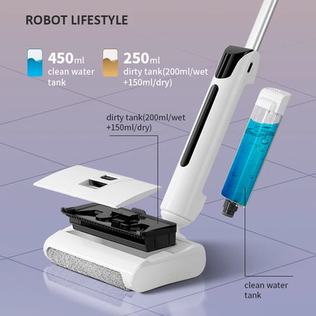 Τροφοδοτείται από μπαταρία Li-ion (7.4V, 200/2400mAh) και είναι πιστοποιημένη CE για αξιοπιστία, φορτίζει σε 4–6 ώρες και λειτουργεί χωρίς καλώδιο, παρέχοντας σας απόλυτη ελευθερία να καθαρίζετε γωνίες, κάτω από έπιπλα και σε στενούς χώρους. Η δεξαμενή καθαρού νερού 450 ml παρέχει επαρκή κάλυψη για σφουγγάρισμα, ενώ οι διπλές δεξαμενές βρώμικου νερού (250 ml + 100 ml) βοηθούν να διατηρείται το βρώμικο νερό ξεχωριστό από το καθαρό νερό για καλύτερη υγιεινή. Το ενσωματωμένο UV φως προσθέτει ένα επιπλέον επίπεδο απολυμαντικής δύναμης σε σφραγισμένες επιφάνειες, βοηθώντας στη μείωση των βακτηρίων καθώς καθαρίζετε. Η σκούπα ρομπότ lifestyle διαθέτει λειτουργία υγρού και ξηρού με φίλτρο Aqua για να συλλαμβάνει σκόνη και να διατηρεί τον αέρα πιο καθαρό καθώς εργάζεστε. Η τυχαία διαδρομή καθαρισμού εξασφαλίζει ότι δεν θα χάσετε σημεία στα δάπεδά σας.