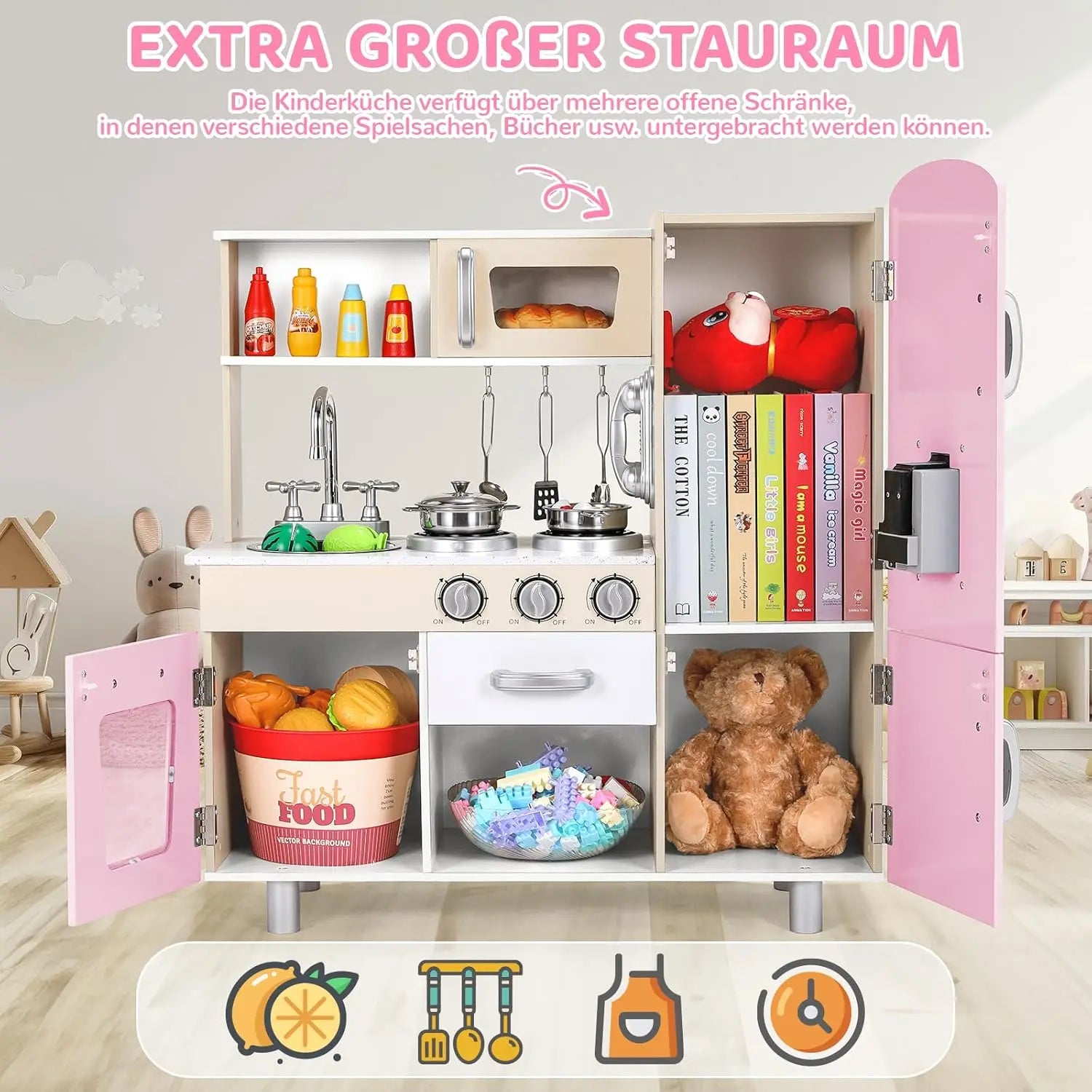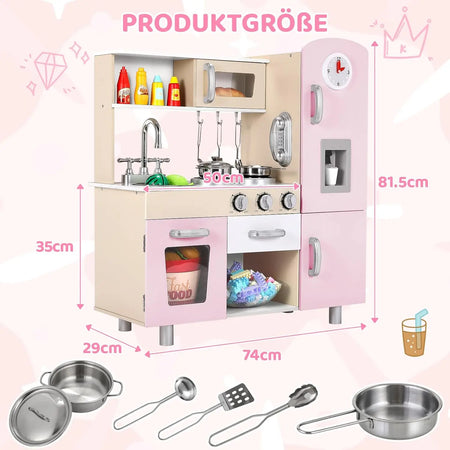 Γνωρίστε το Ξύλινο Παιδικό Σετ Παιχνιδιού Κουζίνας με Φώτα και Ήχους — μια ανθεκτική, οικολογική κουζίνα φανταστικού παιχνιδιού σχεδιασμένη να πυροδοτεί τη φαντασία και να αναπτύσσει πρακτικές δεξιότητες. Κατασκευασμένο από υψηλής ποιότητας MDF με φινίρισμα που μοιάζει με ξύλο, αυτό το σετ αναπαριστά μια ρεαλιστική εμπειρία κουζίνας με εστία, φούρνο, φούρνο μικροκυμάτων, καφετιέρα, νεροχύτη, μηχανή παγωτού, τηλέφωνο, ρολόι και πλήρες σετ μαγειρικών σκευών. Τα ενσωματωμένα προσομοιωμένα φώτα και ήχοι ζωντανεύουν το μαγείρεμα, προσκαλώντας τα παιδιά να παίξουν ρόλους, να εξασκηθούν σε καθημερινές εργασίες και να μοιραστούν δημιουργικές περιπέτειες με την οικογένεια και τους φίλους. Με διαστάσεις 81 x 74 x 30 εκ., χωράει άνετα στα περισσότερα παιδικά δωμάτια και είναι ιδανικό για παιδιά ηλικίας 3–18 ετών. Διατίθεται σε Ροζ, Μπλε και Λευκό για να ταιριάζει σε διαφορετικές διακοσμήσεις δωματίου. Ο σχεδιασμός διαθέτει λείες επιφάνειες και στρογγυλεμένες άκρες για ασφαλές παιχνίδι, καθώς και πολλαπλά ράφια και ντουλάπια για να ενθαρρύνει την τακτοποίηση. Εύκολο στη συναρμολόγηση σε λιγότερο από μία ώρα και απλό στο καθάρισμα με υγρό πανί. Σημείωση: οι μπαταρίες AA δεν περιλαμβάνονται. Όλος ο ηλεκτρονικός και μηχανικός εξοπλισμός, συσκευές και μηχανές που πωλούνται από την InterCyprus σε χώρες της ΕΕ είναι πιστοποιημένα CE και φέρουν εγγύηση δύο ετών. Στο intercyprus.com από το 2002 — αξιόπιστο για ποιότητα και αξιοπιστία.