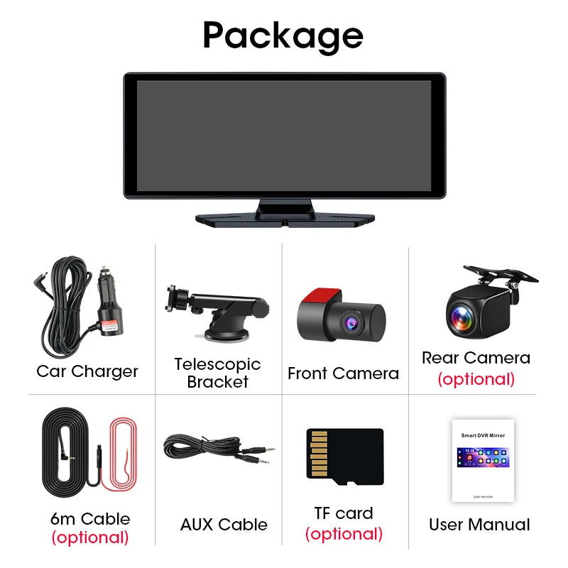 Conozca la Dash Cam Develuck de 10.26 pulgadas — un DVR de doble lente práctico y de alto rendimiento diseñado para una conducción segura e inteligente. Su cámara frontal 2.5K ofrece detalles nítidos, mientras que la cámara trasera opcional añade conciencia situacional detrás de usted. La brillante pantalla IPS de 10.26" facilita la reproducción y configuración, y la compatibilidad con CarPlay/Android Auto mantiene las funciones del teléfono a mano sin distracciones. Un registrador GPS externo graba datos precisos de ubicación, velocidad e información de ruta para evidencia y monitoreo confiables.