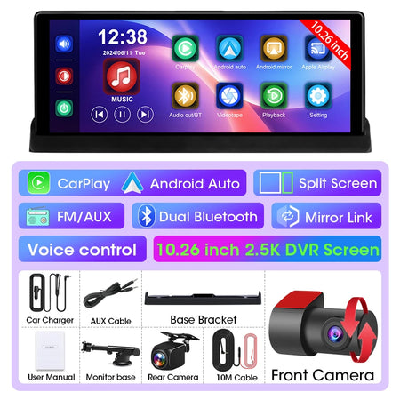 Cámara de tablero de 10.26 pulgadas DVR de doble lente 2.5K CarPlay inalámbrico GPS