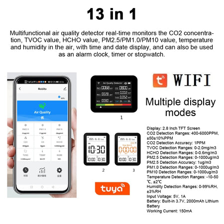 13 En 1 Monitor de Calidad del Aire Tuya WiFi CO2 TVOC PM25 PM10
