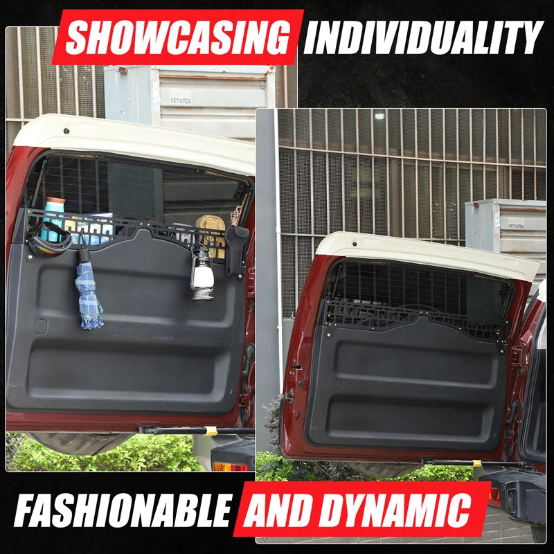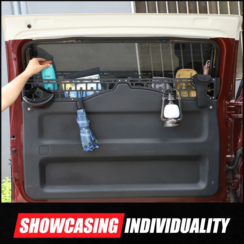 - Mantenga la carga organizada: Use la valla para crear compartimentos para comestibles, herramientas, equipo deportivo o elementos esenciales de camping dentro del área de la puerta trasera.