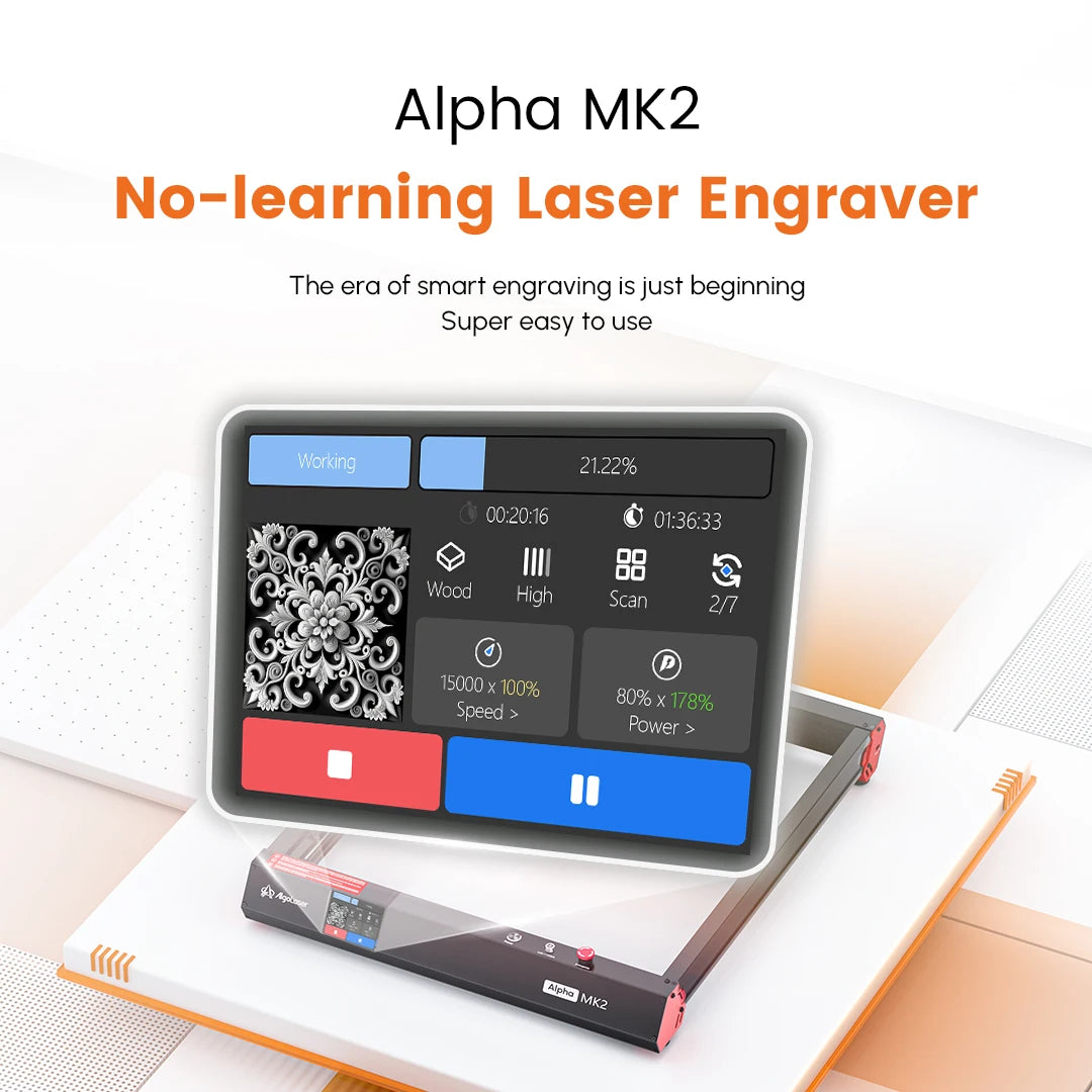 Descubre grabado y corte precisos y de alta velocidad con el Grabador Láser AlgoLaser Alpha MK2 de 20W, ahora con una conveniente pantalla táctil IPS de 3.5". Diseñado para entusiastas del bricolaje y pequeñas empresas, este láser inteligente ofrece detalles limpios en una amplia gama de materiales, desde madera y acrílico hasta acero inoxidable cepillado. Con un generoso área de grabado de 400x400 mm y una longitud focal de 5 mm, puedes abordar proyectos más grandes con menos pasadas, ahorrando tiempo y costos de material.