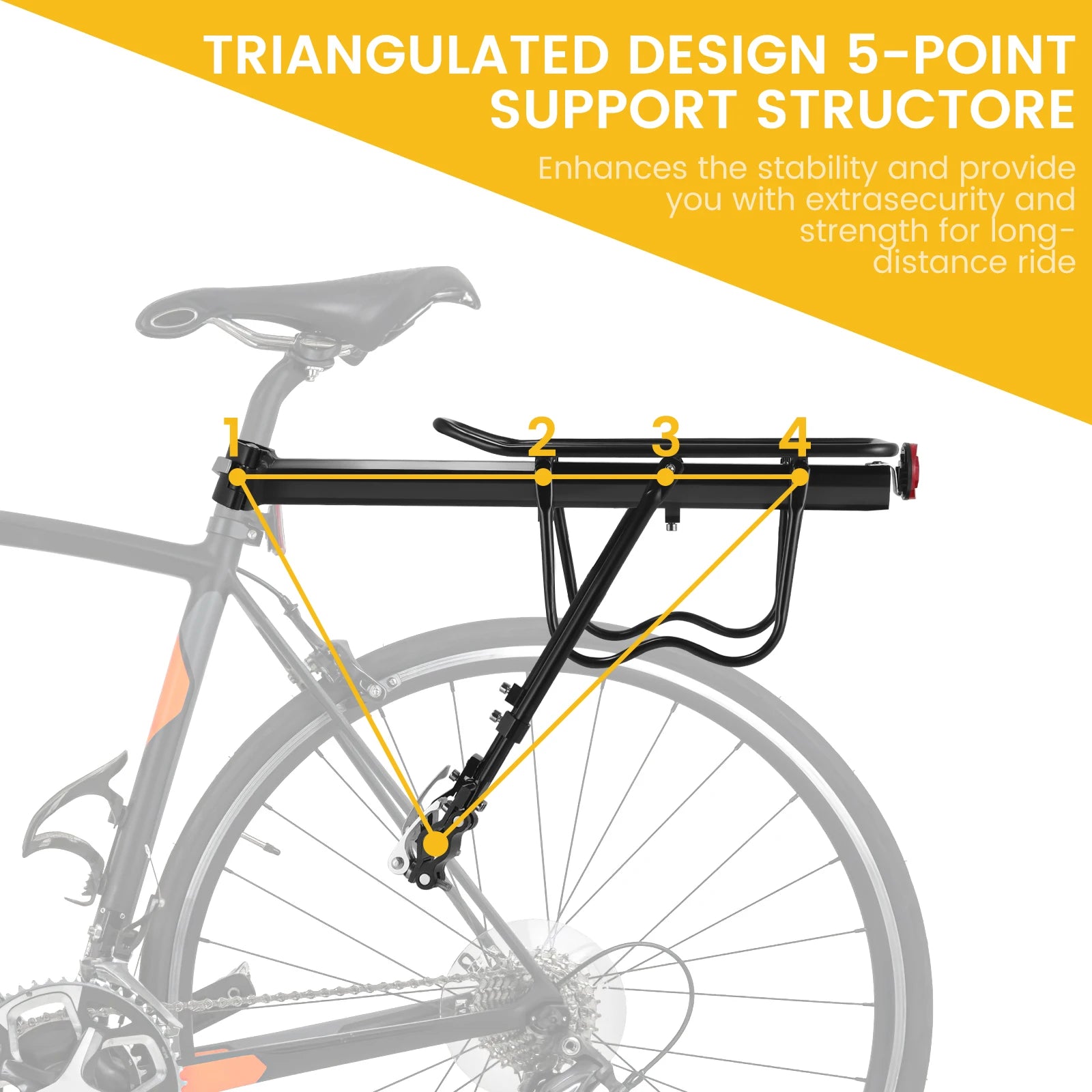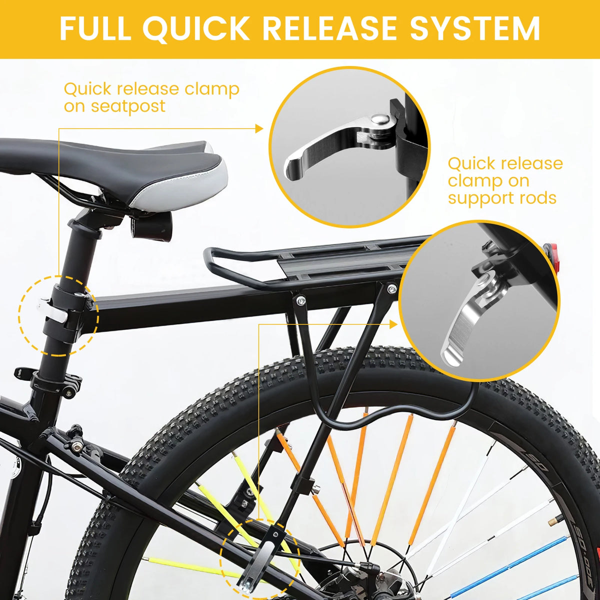 - La instalación de liberación rápida facilita colocar o quitar el portaequipajes sin herramientas, y es compatible con tubos de asiento ≤32 mm.