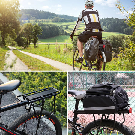 - Lleve alforjas, bolsas, mochilas o carga con estabilidad para excursiones de un día o aventuras en bicicleta.