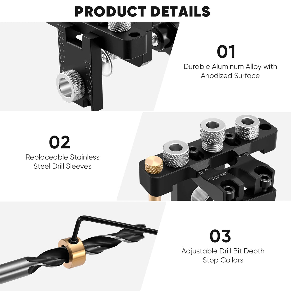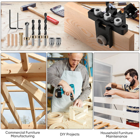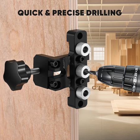 El ancho de sujeción ajustable acomoda grosores de tablero de 12 a 33 mm (0.47–1.3 in). El localizador de espigas soporta tanto el montaje vertical para perforación de bordes como el montaje horizontal para perforación de superficies, haciéndolo versátil para una variedad de tareas de carpintería. El mecanismo de punzonado de la herramienta puede cambiar de dirección para adaptarse a su orientación de perforación, y su diseño desmontable la mantiene portátil para trabajo en sitio o uso en taller.