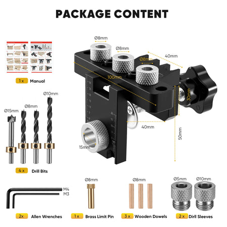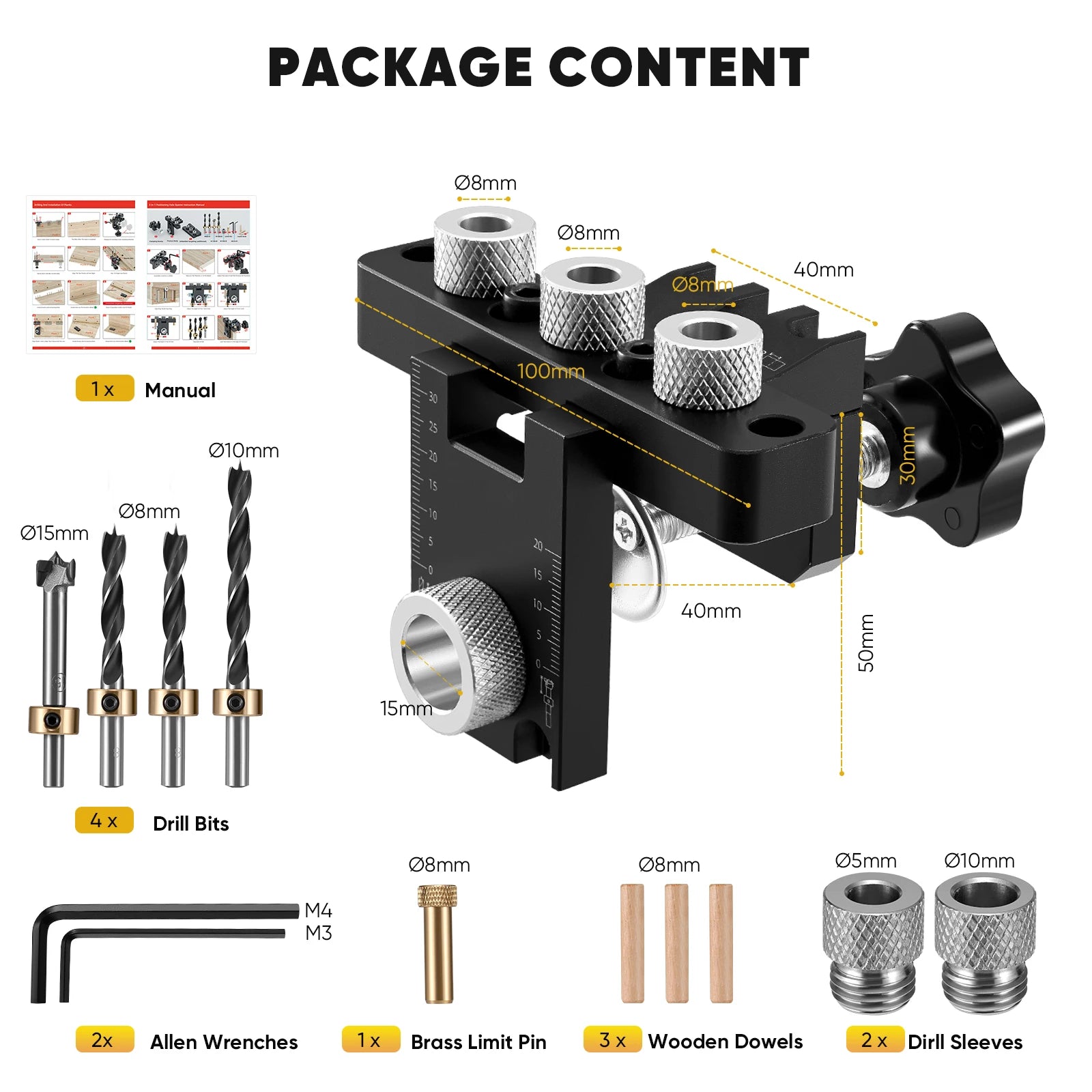 Presentamos el Juego de Guía de Taladro para Plantillas de Espigas Ajustable de 8 10 15 mm — una herramienta práctica de carpintería diseñada para simplificar el espigado y lograr uniones precisas y duraderas. Este kit incluye 4 brocas (2x Ø8 mm, 1x Ø10 mm, 1x Ø15 mm), 2 fundas de taladro (1x Ø5 mm, 1x Ø10 mm) y 3 espigas de madera (Ø8 mm) para cubrir una variedad de uniones comunes en paneles y muebles. Es ideal para la fabricación de gabinetes, ensamblaje de muebles y proyectos de carpintería DIY.