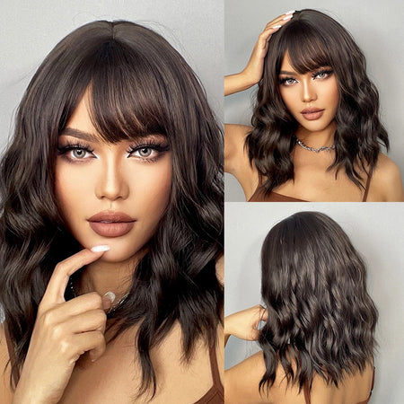 - 1 Peluca corta ondulada media castaño rojizo con flequillos
