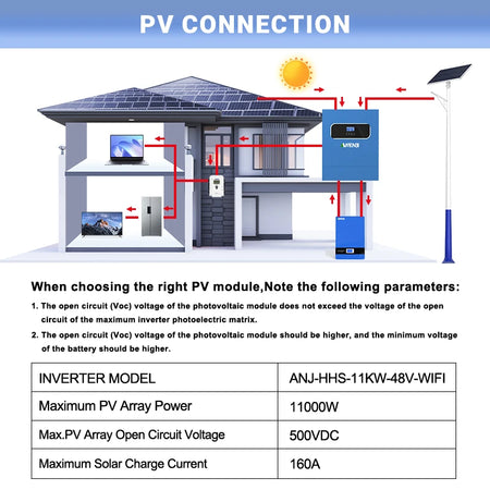 Conozca el Inversor Solar Híbrido ANEN 11kW 48V con Doble MPPT y WiFi incorporado: una solución potente y confiable para hogares que buscan una integración solar sin interrupciones, soporte para baterías y monitoreo inteligente. Con una capacidad robusta de carga de 11,000 W y una salida de 220V, esta unidad está diseñada para combinar energía solar, red eléctrica y almacenamiento para mantener su hogar funcionando sin problemas incluso cuando las condiciones cambian.