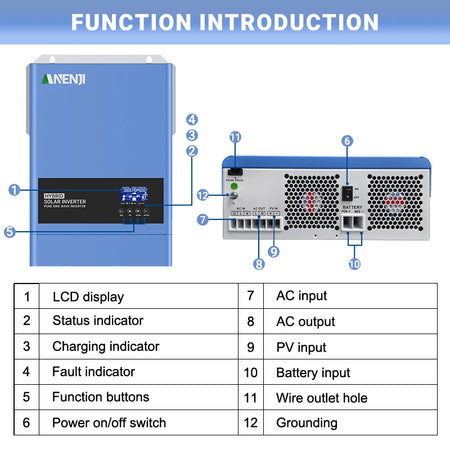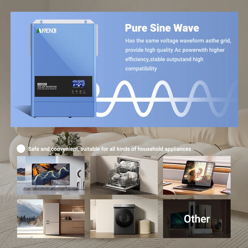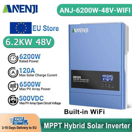 ANENJI ANJ-6200W-48V-WIFI es un inversor solar híbrido de 6.2 kW diseñado para ofrecer energía confiable y flexible en hogares y pequeños comercios. Diseñado para sistemas de baterías de 48V, proporciona energía limpia y estable con una onda sinusoidal pura y un factor de potencia de 1.0, asegurando que tus dispositivos electrónicos sensibles funcionen sin problemas. El amplio rango de entrada FV de 60–500V CC te permite configurar diversos arreglos solares, mientras que el MPPT incorporado de 120A maximiza la captación de energía en diferentes condiciones de sol. Este inversor puede operar incluso sin batería, ofreciendo versatilidad para aplicaciones conectadas a la red y fuera de ella. Una cubierta desmontable contra el polvo soporta ambientes adversos, y el WiFi opcional permite la monitorización remota para un seguimiento conveniente del rendimiento. Con múltiples prioridades de salida (UTL, SOL, SBU, SUB), una función EQ para optimizar la salud de la batería y compatibilidad con baterías LiFePO4 vía RS485 más una función de activación de litio activada por la red o FV, esta unidad se adapta a una amplia gama de configuraciones de almacenamiento de energía. Ya sea que estés actualizando un sistema existente o construyendo una nueva instalación híbrida, el ANJ-6200W-48V-WIFI ofrece una entrega de energía robusta y operación flexible para tu solución solar.