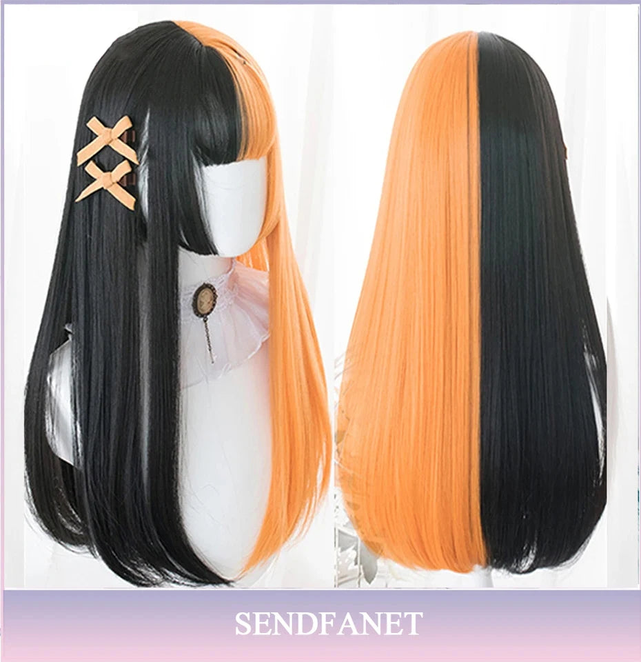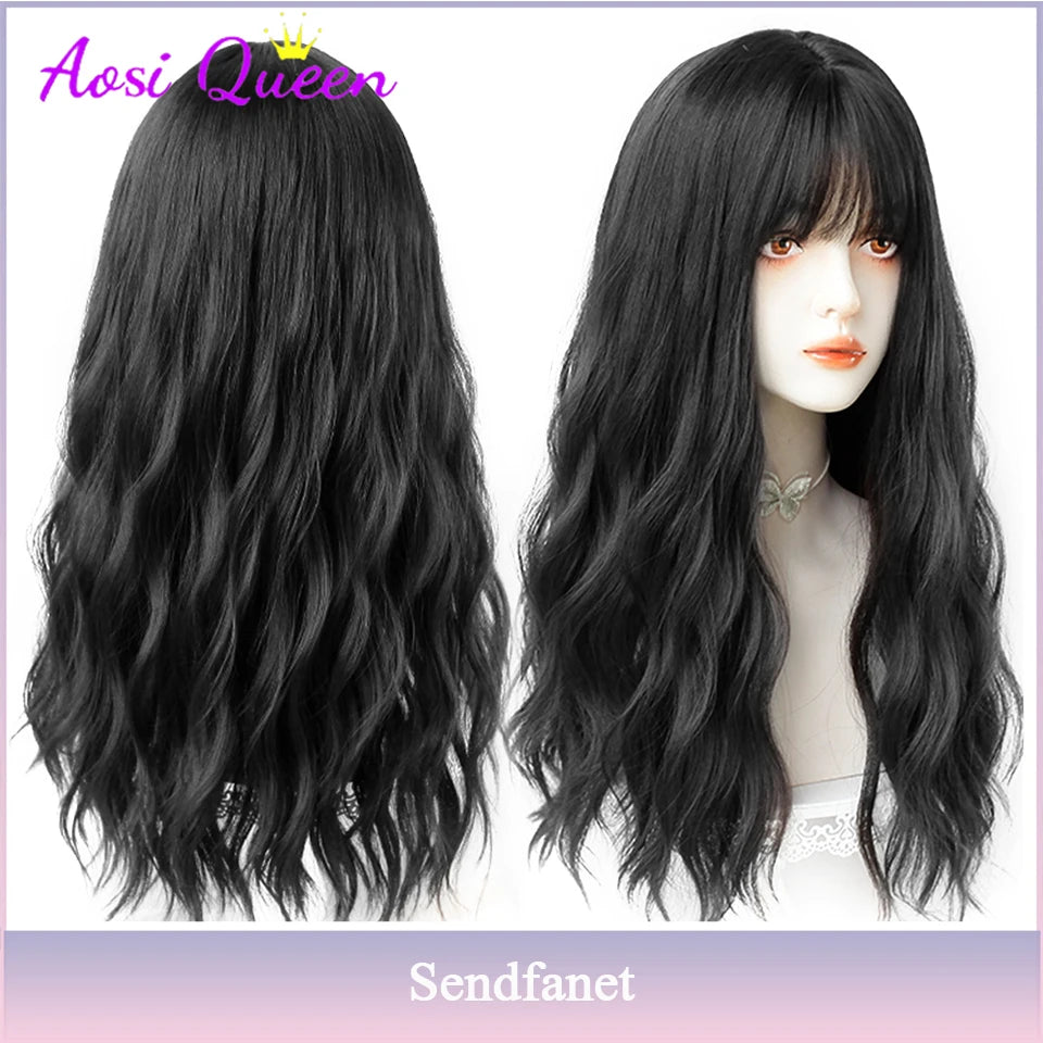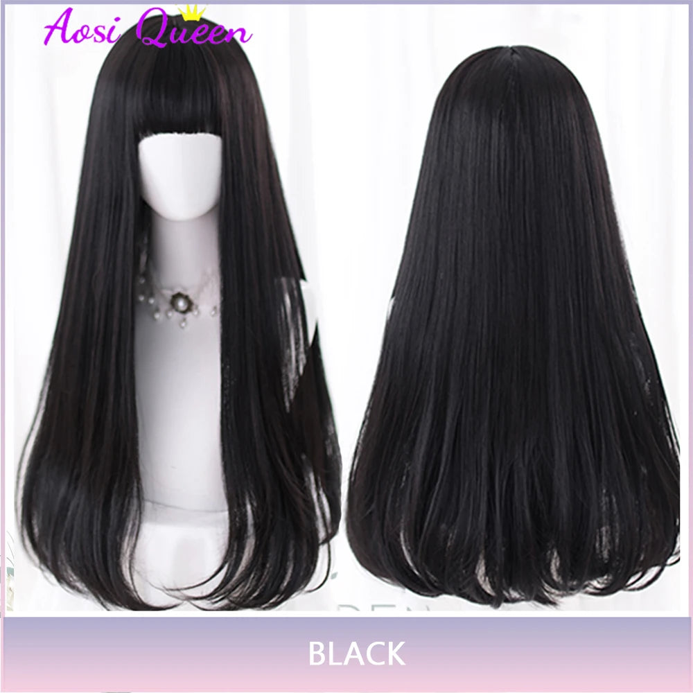 Peluca Sintética Negra Larga y Lisa con Flequillo para Cosplay y Uso Diario