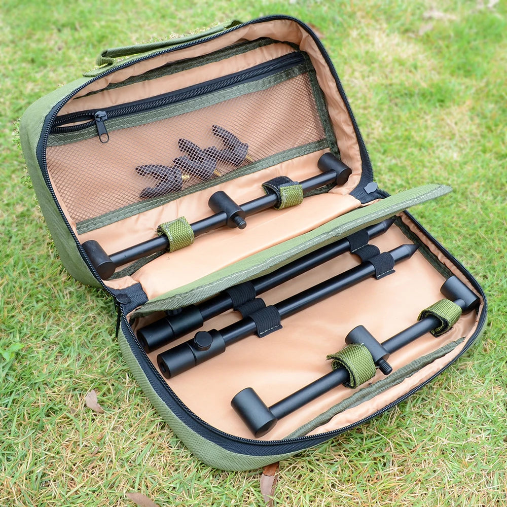 - Incluye barra de zumbido, varas de banco y 3 cabezales de caña para un espaciado flexible y ajustes rápidos de aparejos. La bolsa de transporte mantiene todo organizado.