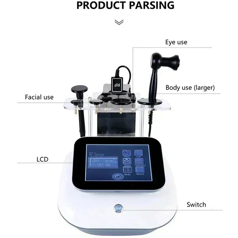Presentando la Máquina de Belleza RF Monopolar para la Eliminación de Grasa Corporal y Elevación—un dispositivo versátil y no invasivo diseñado para levantar, tensar y rejuvenecer la piel en la cara, alrededor de los ojos y en todo el cuerpo. Utilizando tecnología RF monopolar capacitiva de 448K, esta máquina compacta entrega energía de radiofrecuencia precisa para calentar capas más profundas de la piel, estimulando la producción de colágeno y promoviendo resultados más firmes. Adecuada para uso doméstico o entornos profesionales, ayuda a reducir arrugas, tensar la piel flácida y refinar contornos sin cirugía.