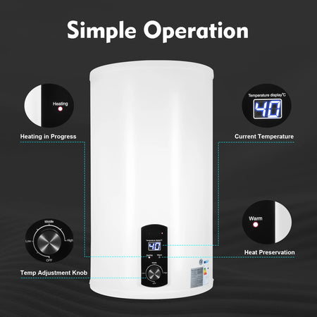 Calentador de Agua Eléctrico 70L – Control de Temperatura 77-167F — Un calentador de agua eléctrico blanco moderno de 70 litros que ofrece un control de temperatura preciso de 77–167°F para agua caliente constante en cocinas, baños, salones, caravanas y espacios comerciales.