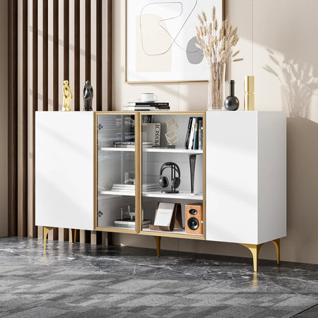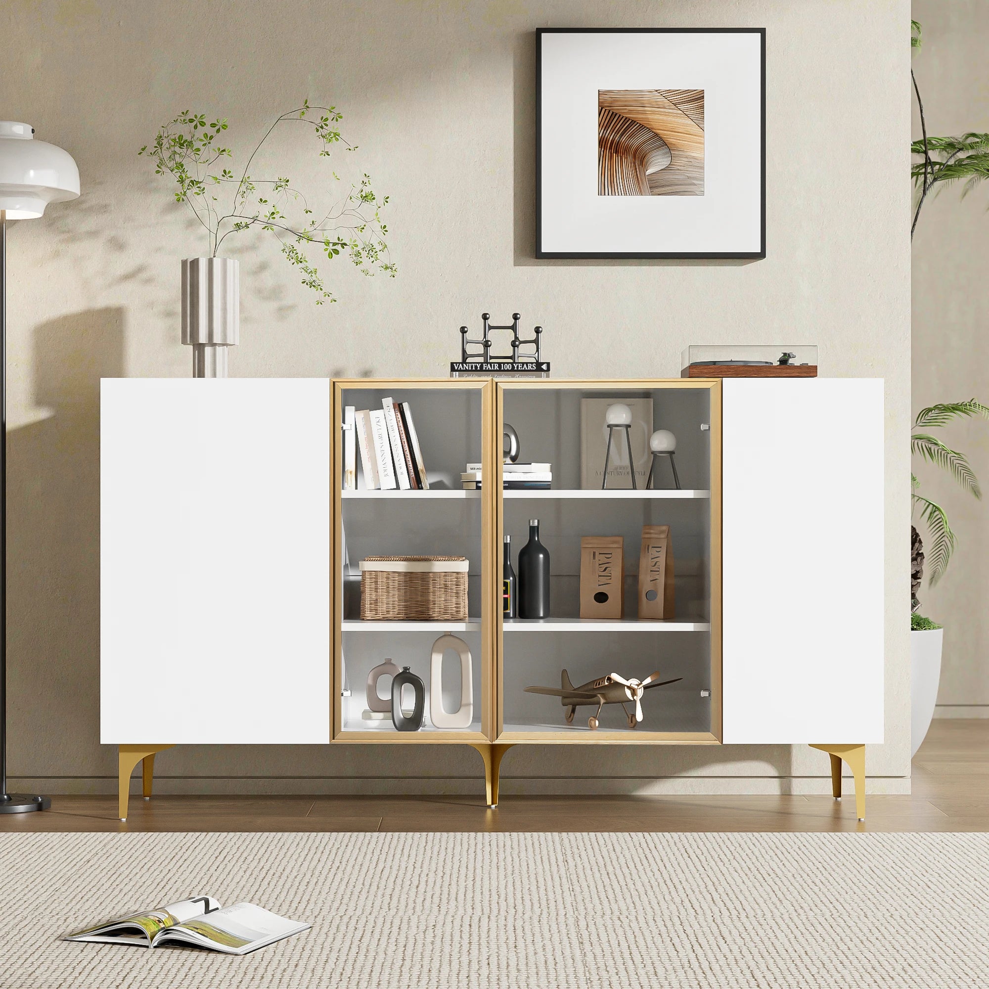 Descubra el Aparador Blanco de Cuatro Puertas con Vidrio y Metal: una solución de almacenamiento moderna y sin tiradores diseñada para comedores y espacios de estar contemporáneos. Construido con un núcleo robusto de MDF, un marco de aluminio y vidrio templado, este aparador ofrece almacenamiento duradero y un aspecto minimalista y nítido. Cuatro puertas dispuestas asimétricamente se abren suavemente para revelar un espacio generoso para platos, libros o decoración, mientras que las patas de metal de color dorado añaden un toque industrial y refinado.