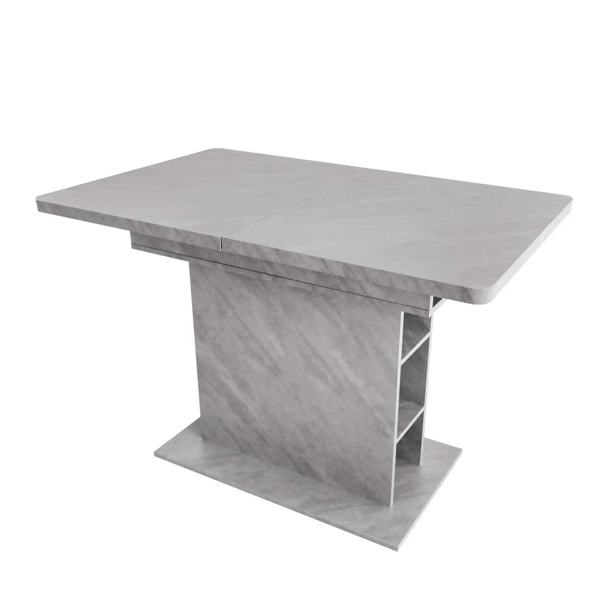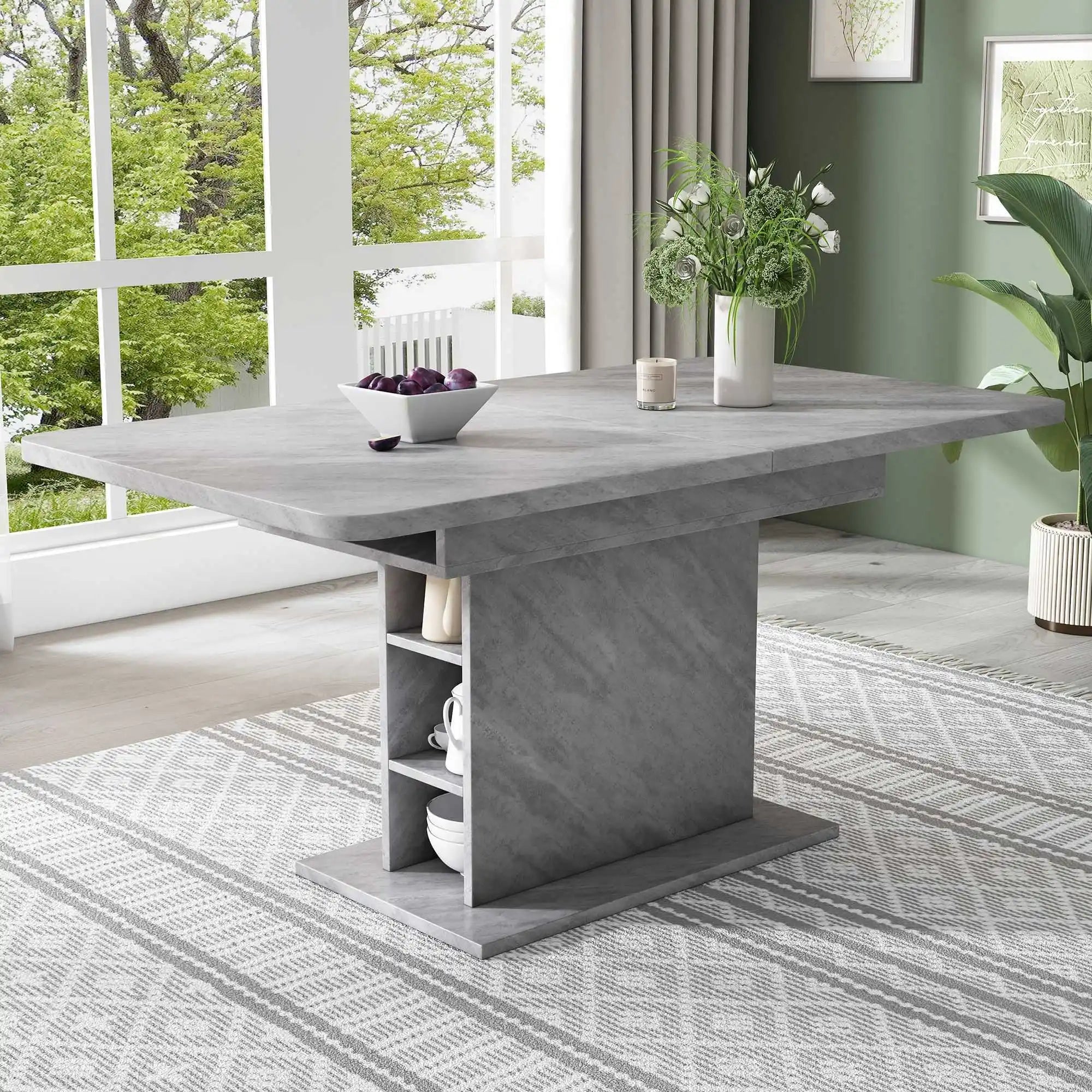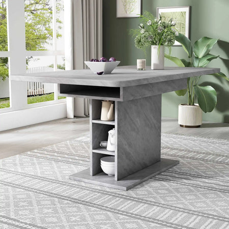 Conozca la Mesa de comedor rectangular extensible con espacio de almacenamiento — un centro moderno diseñado para una vida flexible. Su extensión telescópica le permite alargar la superficie para acomodar invitados, convirtiendo las comidas diarias en encuentros sociales. El área de almacenamiento incorporada mantiene los esenciales del comedor ordenadamente guardados, ayudando a que su espacio se mantenga limpio. Una columna central combinada con bloques izquierdo y derecho maximiza la utilización del espacio y la comodidad para las piernas, haciendo que incluso habitaciones más pequeñas se sientan más abiertas. Perfecta como mesa de comedor, superficie de trabajo o espacio creativo, esta mesa es tan versátil como las necesidades de su familia. Instrucciones claras de montaje y todo el hardware necesario hacen que la instalación sea sencilla — usualmente alrededor de 20 minutos.