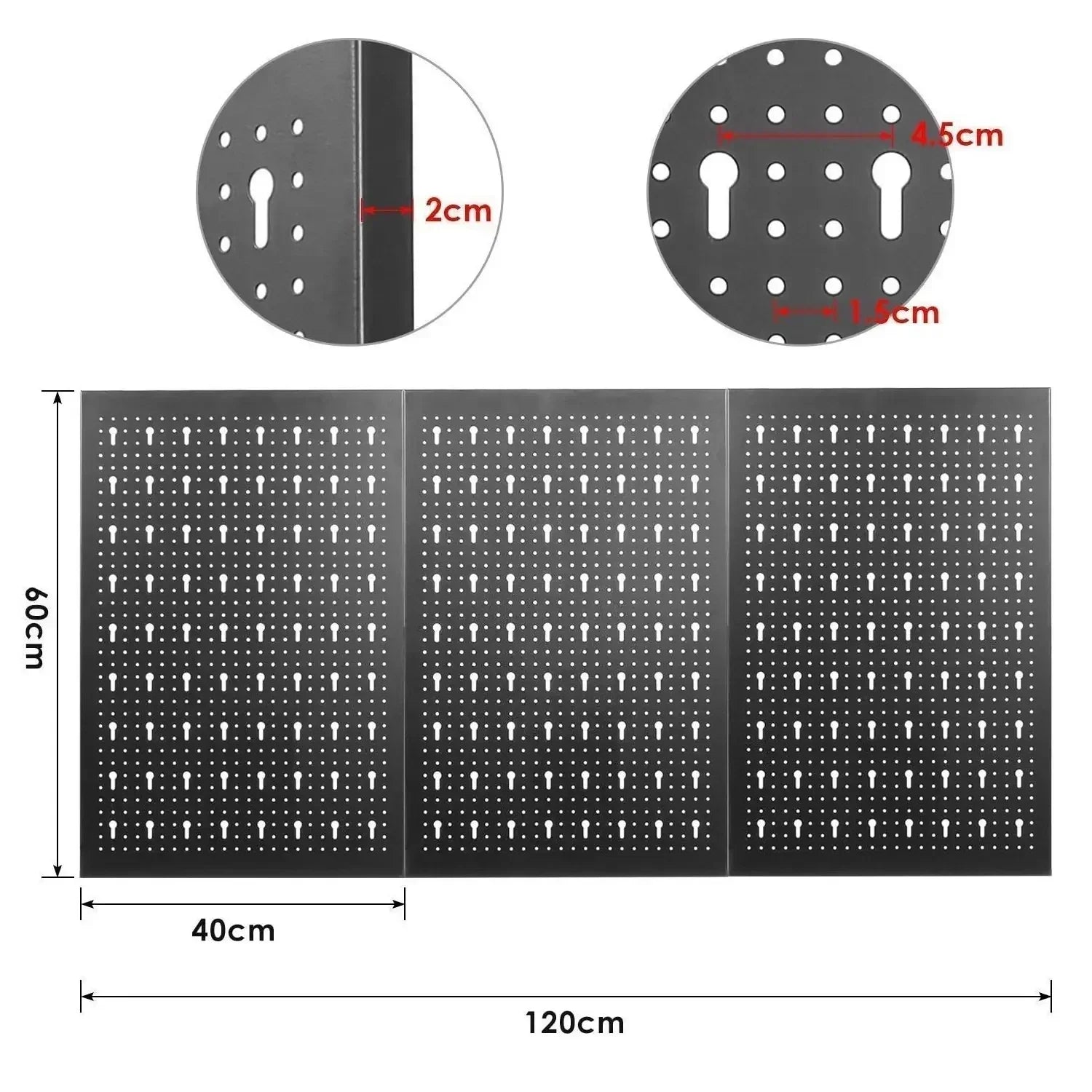 Panel de pared de herramientas perforado de 120x60x2cm con ganchos y soportes