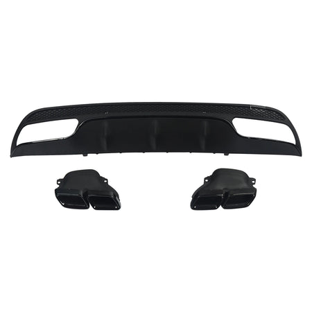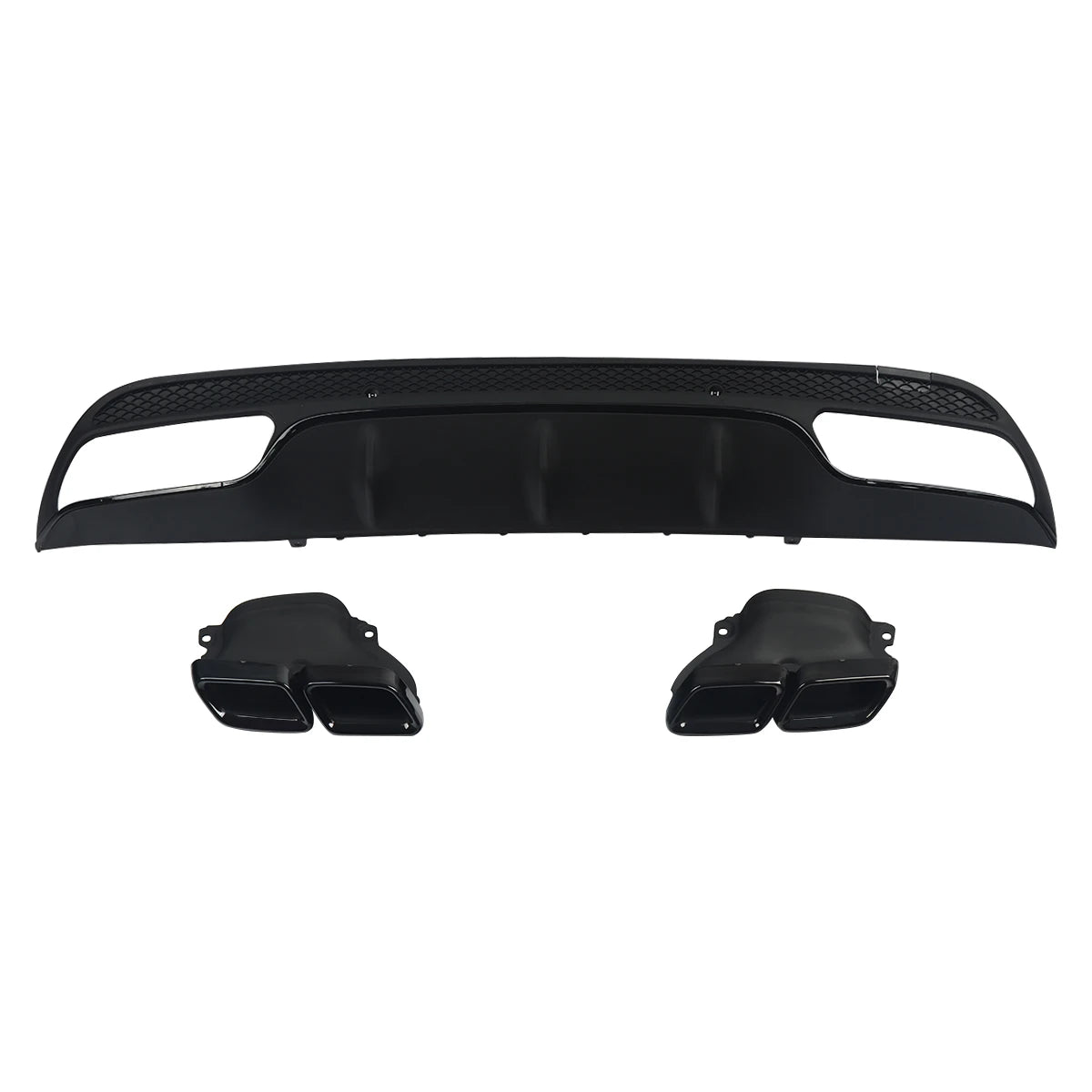 - El paquete incluye: 1 x Difusor trasero estilo C63 (con moldura); 2 x Tubos de escape cuadrados negros; 2 x Soportes; Algunos accesorios de instalación