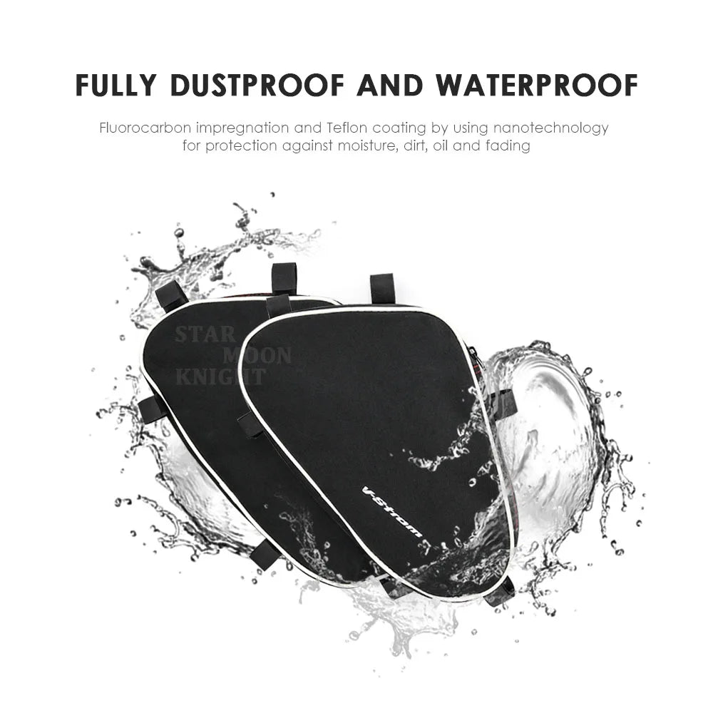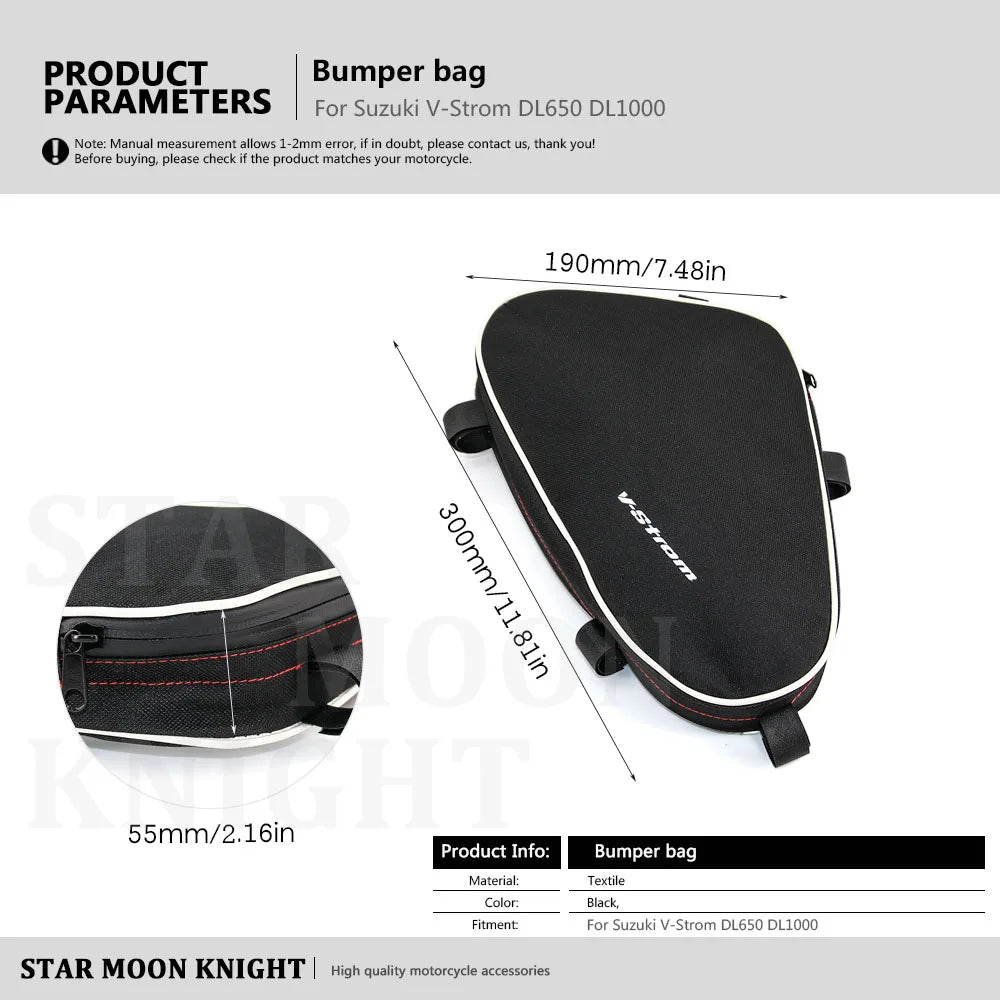 Mejore su Suzuki V-Strom DL650/DL1000 con un accesorio duradero de protección del marco: un par de bolsas de correa repelentes al agua diseñadas para montarse en las barras de protección del tanque Givi/Kappa. Estas bolsas mantienen lo esencial al alcance mientras conduce, reduciendo la necesidad de rebuscar dentro de su mochila o bolsa de tanque durante paradas rápidas.