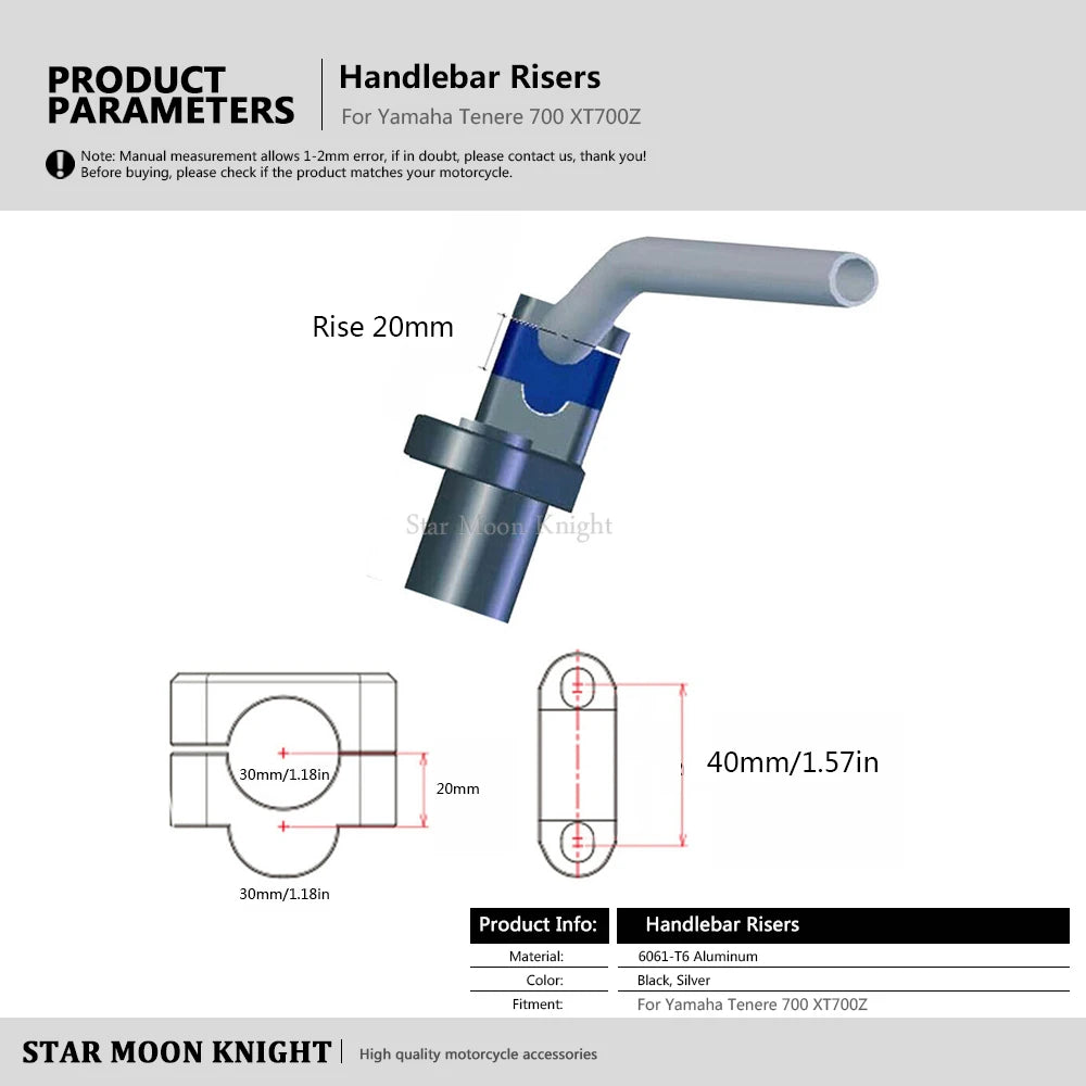 Elevadores de manillar Yamaha Tenere 700, elevación de 20mm, elevador de montaje de aluminio CNC billet para XT700Z XTZ 2019