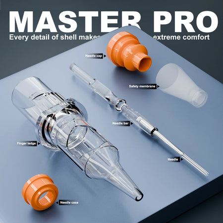 Diseñados para ser compatibles con la mayoría de los grips y máquinas de cartucho, los cartuchos KVM ofrecen mejor visibilidad, un fuerte almacenamiento de tinta y un flujo suave que minimiza el trauma en la piel. La carcasa transparente te permite monitorear el flujo de tinta de un vistazo, ayudándote a lograr resultados limpios y consistentes. Cada bolsa estéril imprime claramente el tipo de aguja y la fecha de caducidad, para que puedas trabajar con confianza y nunca adivinar qué estás usando.