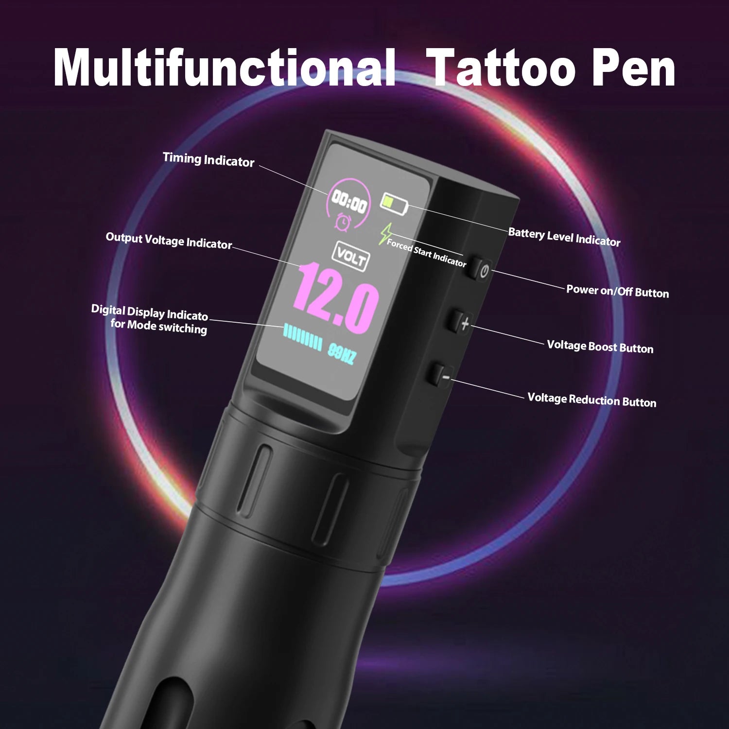 La característica principal es la fuente de alimentación digital IPS con una lectura similar a un LCD que muestra voltaje y frecuencia, para que puedas ajustar configuraciones exactas para resultados consistentes. El recorrido de 3.5mm y el mecanismo de transmisión directa ofrecen una acción de aguja suave, mientras que la carcasa de aleación de aluminio mantiene la unidad ligera pero resistente. Una batería recargable (1800mAh) alimenta sesiones largas; una carga completa de 2 horas proporciona hasta 8 horas de trabajo, ideal para sesiones de tatuaje prolongadas o días ocupados en el estudio.
