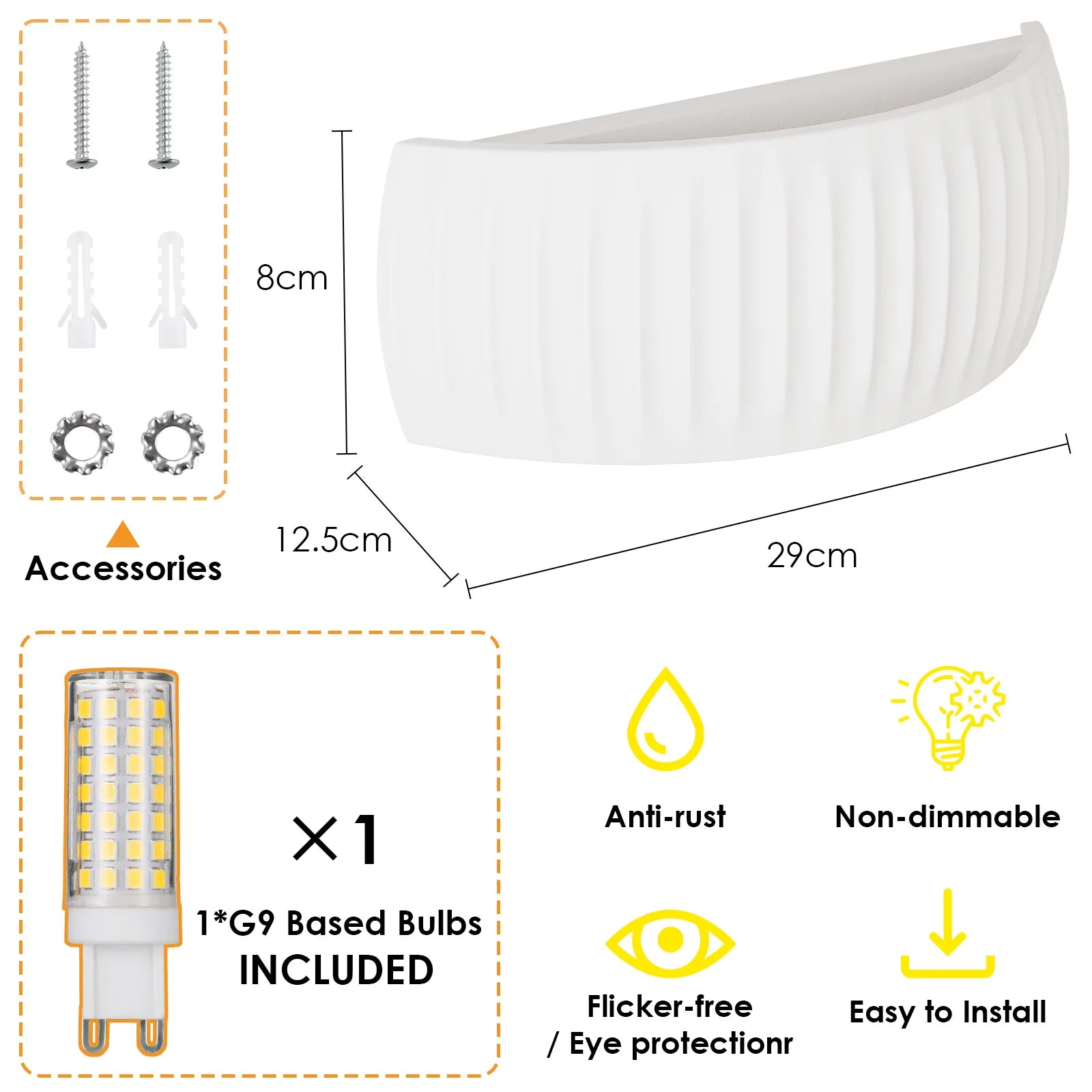 Presentamos la lámpara de pared LED Wall Sconce Lighting Fixture Lamps 6W Warm White 3000K Up and Down — una lámpara de pared de yeso fabricada con yeso natural que combina estética contemporánea con rendimiento robusto. Esta luz de pared ofrece una luz cálida y acogedora con iluminación dual hacia arriba y hacia abajo, perfecta para salas de estar, dormitorios, pasillos y más. Incluye una bombilla LED G9 de alta calidad y está diseñada para instalación cableada en paredes interiores, ofreciendo un aspecto limpio y duradero.